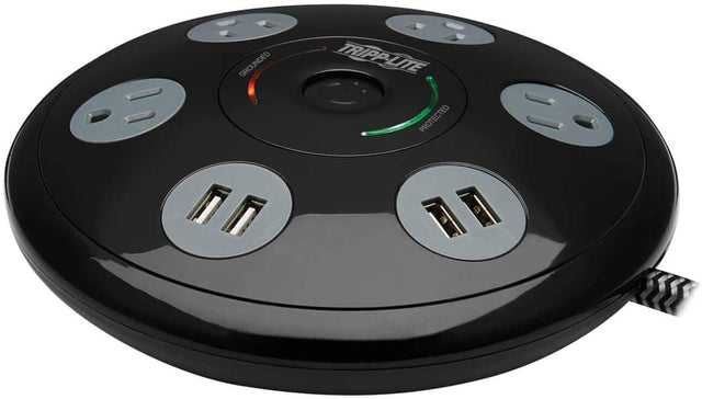 Keep Your Team’s Devices Powered and Charged During Important Meetings Workplace meetings involve a variety of devices – laptops, smartphones, tablets – to keep everyone coordinated and up to date with the information necessary to make important decisions. Guaranteeing those devices remain charged and powered is Tripp Lite’s Conference Power Surge Protector. Rounded to ensure equal access to everyone at the table, this UL-certified surge protector delivers ample power and reliable protection to as many as eight mobile devices at the same time. NEMA 5-15R Outlets Accept a Wide Range of Electronic Devices Plug your laptops, projector, printer or other conference-table electronics into four NEMA 5-15R outlets to protect them against dangerous surges, spikes and line noise. Each outlet is located far enough apart from the others to accept bulky transformers without blocking adjacent outlets. 4 USB-A Ports Share 4.2 Amps of Charging Power The USB ports are available for charging your smartphones, tablets and other USB mobile devices. They share 4.2A of charging power, which is plenty for delivering ample power to demanding devices. 1800 Joules Safeguard Your Sensitive Electronics This Protect It!® surge protector features a surge suppression rating of 1800 joules to defend your sensitive electronic components against even the strongest power surges and spikes. Because residential power outlets have three wires—hot line (H), neutral (N) and ground (G)—the TLP406USBUFO protects all three, covering the two protection modes: full normal mode (H-N) and common mode (N-G/H-G). Premium Protection from EMI/RFI Line Noise Helps Your Equipment Perform Better Various electromagnetic and radio sources found in virtually every home and business can cause disruptive interference on the AC line. Known as EMI (electromagnetic interference) and RFI (radio frequency interference), this line noise is a common cause of performance problems. This surge protector filters out disruptive line noise that can disturb your electronics and inflict hardware damage or data loss. This EMI/RFI filtering also helps your connected components perform better and last longer. Premium Safety Features Protect Your Valuable Equipment The on/off switch provides one-touch control over all connected equipment. Red and green LEDs confirm your connected equipment is grounded and protected. Right-Angle Plug Makes Connecting in Tight Spaces Easier The space-saving right-angle NEMA 5-15P connector with 6-ft. (1.83 m) braided power cord is easy to install in confined spaces, such as behind a computer desk or workstation. The right-angle construction also relieves strain on the cable and connector and prevents the cable from bending awkwardly.