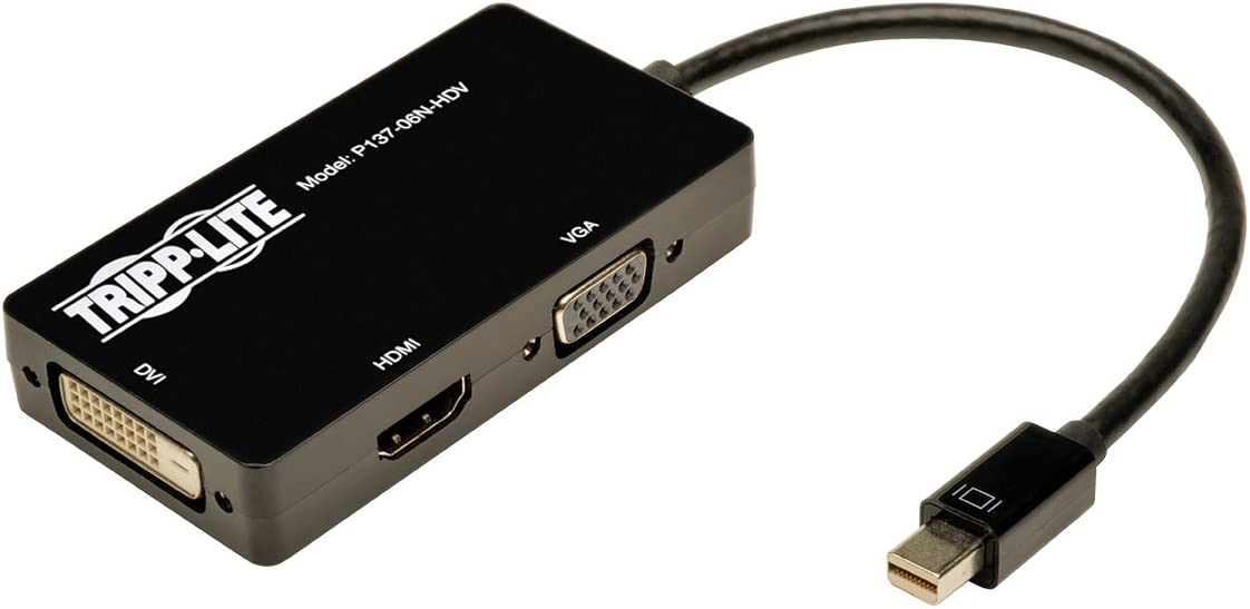Tripp Lite P137-06N-HDV allows you to convert your computer's Mini Displayport (Thunderbolt) to a VGA, DVI, or HDMI monitor as an all-in-one, compact adapter. This passive, plug-and-play adapter requires no external power, drivers, or software, and supports video resolutions up to 1920 x 1200, or HD video resolutions up to 1920 x 1080 ( 1080p ). Compatible with the Thunderbolt port on MAC computers such as MacBook Pro and MacBook Air.
