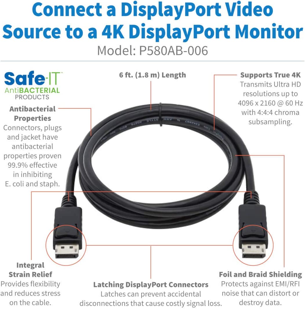 4K DisplayPort Cable Connects Home Theater or Digital Signage Audio/Video Components This high-speed DisplayPort cable securely connects laptops, tablets, PCs, Blu-ray players, game consoles, satellite/cable TV receivers and other devices with DisplayPort outputs to HDTVs, HD monitors, projectors or home theater receivers with DisplayPort inputs. The 4K P580AB-006 is backward compatible with all your existing DisplayPort devices. Provides Extra Protection Against Certain Bacteria The molded connectors and PVC jacket are constructed using an antibacterial material that is 99.9% effective in inhibiting Escherichia coli (E. coli) and Staphylococcus aureus (staph). This added protection makes this cable an ideal solution for medical facilities, schools, businesses, restaurants/kitchens and anywhere else that needs extra protection against bacteria. Transmits Crystal-Clear True 4K Video with Audio and 4:4:4 Color The P580AB-006 supports Ultra HD resolutions up to 4096 x 2160 (4K x 2K) at 60 Hz. HDCP 2.2 compliance allows you to stream 4K Amazon and Netflix content with no complications. The cable also supports 4:4:4 chroma subsampling for top-level PC gaming or using your HDTV as a PC monitor. Latching Connectors Help Prevent Accidental Disconnection and Expensive Downtime Having a cable come loose accidentally can mean costly and time-consuming signal loss. The latching DisplayPort connectors help you avoid such danger, protecting your audio/video transmission by maintaining a secure link without failure. The latching cable is also invaluable when moving equipment in a rack or removing equipment from tight areas, ensuring the cord always stays connected. Premium Construction for Superior Performance The P580AB-006 features foil and braid shielding that ensures reliable, error-free signal quality and protection from EMI/RFI line noise that can distort or destroy data. Gold-plated contacts provide maximum conductivity and minimum data loss to guarantee a clear transmission free of interference. Integral strain relief gives the cable extra flexibility, reduces stress and helps the cable move freely without cracking or breaking loose from the connector.