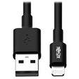 Tripp Lite's M100-006-BK 6-ft. (1.83 m) Black USB Sync / Charge Cable with Lightning connector allows for uploading and downloading data, while charging the devices at the same time. Cable is MFi-certified for use with the latest generation of iPhone, iPad and iPod devices. Reversible Lightning connector allows plug-ability in either direction to the device.