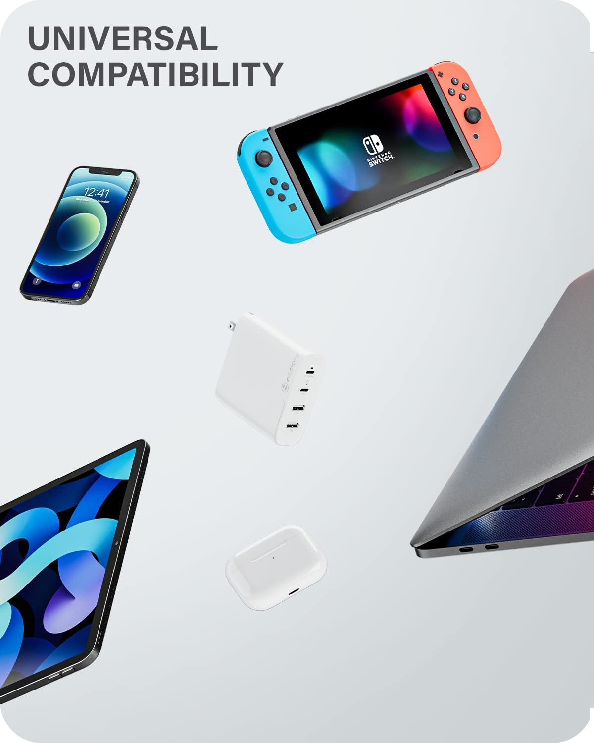 - 100W 4 Port Charging: Quick charge 4 devices (2 USB-C, 2 USB-A) at the same time, Max 100W, 2 x USB-C (supporting Power Delivery 3.0) and 2 x USB-A ports. 100W to quick charge a laptop, a tablet, smartphone, and mobile device at the same time. USB-C #1 single output: PD3.0 (5,9,15V/3A, 20V/5A) – 100W* | USB-C #2 single output: PD3.0 (5V/3A, 9V/2A) – 18W | USB-A #1 + #2 output: 5V/3.4A – 17W | *Derated when all ports active as follows: USB-C #1 65W + USB-C #2 18W, USB-A #1 + #2 17W