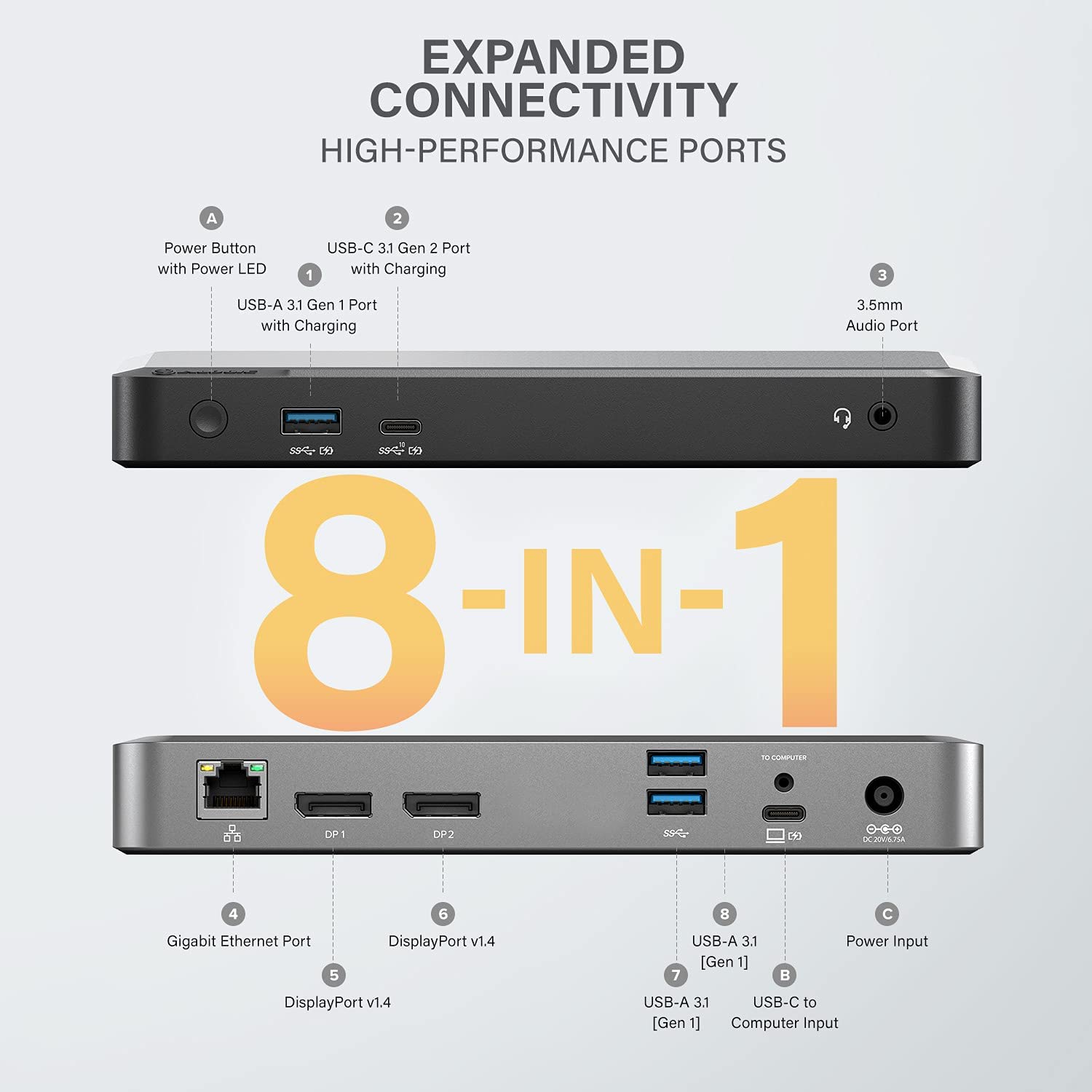 - Full Featured USB-C Dock: The ALOGIC Dual 4K Display Universal Docking Station – DX2 is designed to expand the capabilities of any laptop by introducing a wide variety of connectivity options such as 2 x DisplayPort (DP1.4/DP++), 1 x USB-C 3.1 Gen 2 (10G) BC 1.2 and Apple Charging Support, 1 x USB-A 3.1 Gen 1 (5G) BC 1.2 and Apple Charging Support, 2 x USB-A 3.1 Gen1 (5G), 1 x 3.5mm TRRS Audio / Microphone Jack, 1 x RJ45 Ethernet 1Gbps.