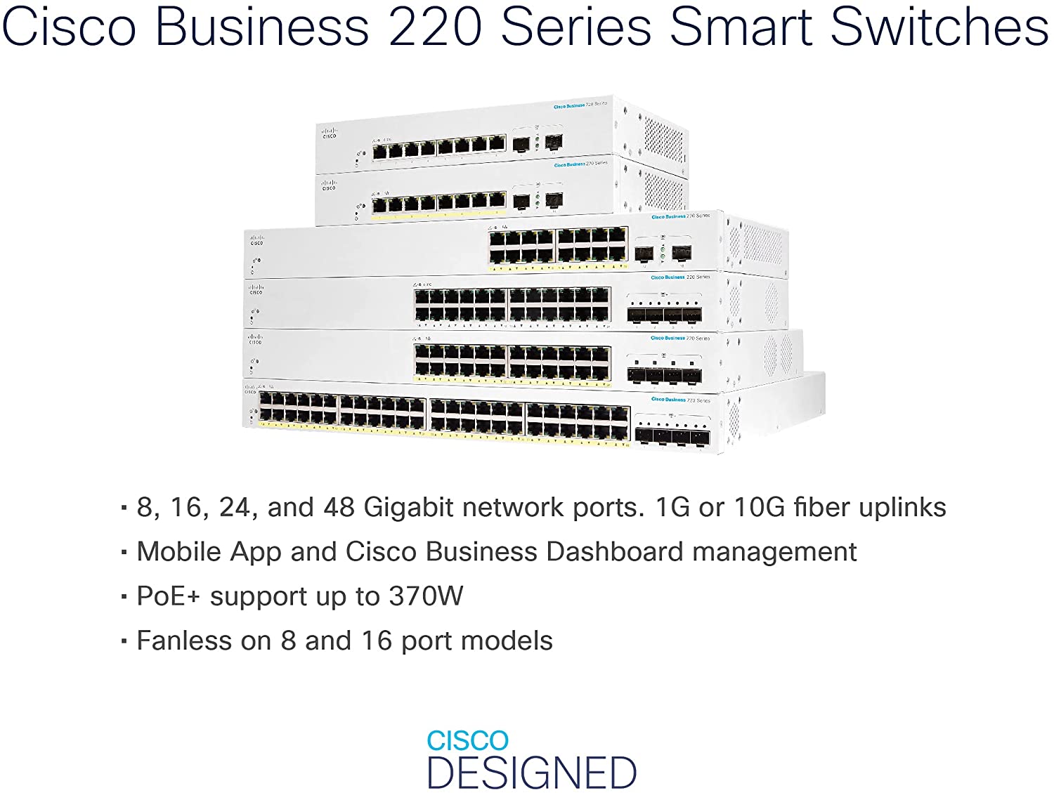 CISCO DESIGNED CBS220-8T-E-2G Smart Switch | 8 Port GE | 2x1G Small Form-Factor Pluggable (SFP) | 3-Year Limited Hardware Warranty (CBS220-8T-E-2G-NA) 8-port GE / 2 x GE Uplinks / External Power Supply