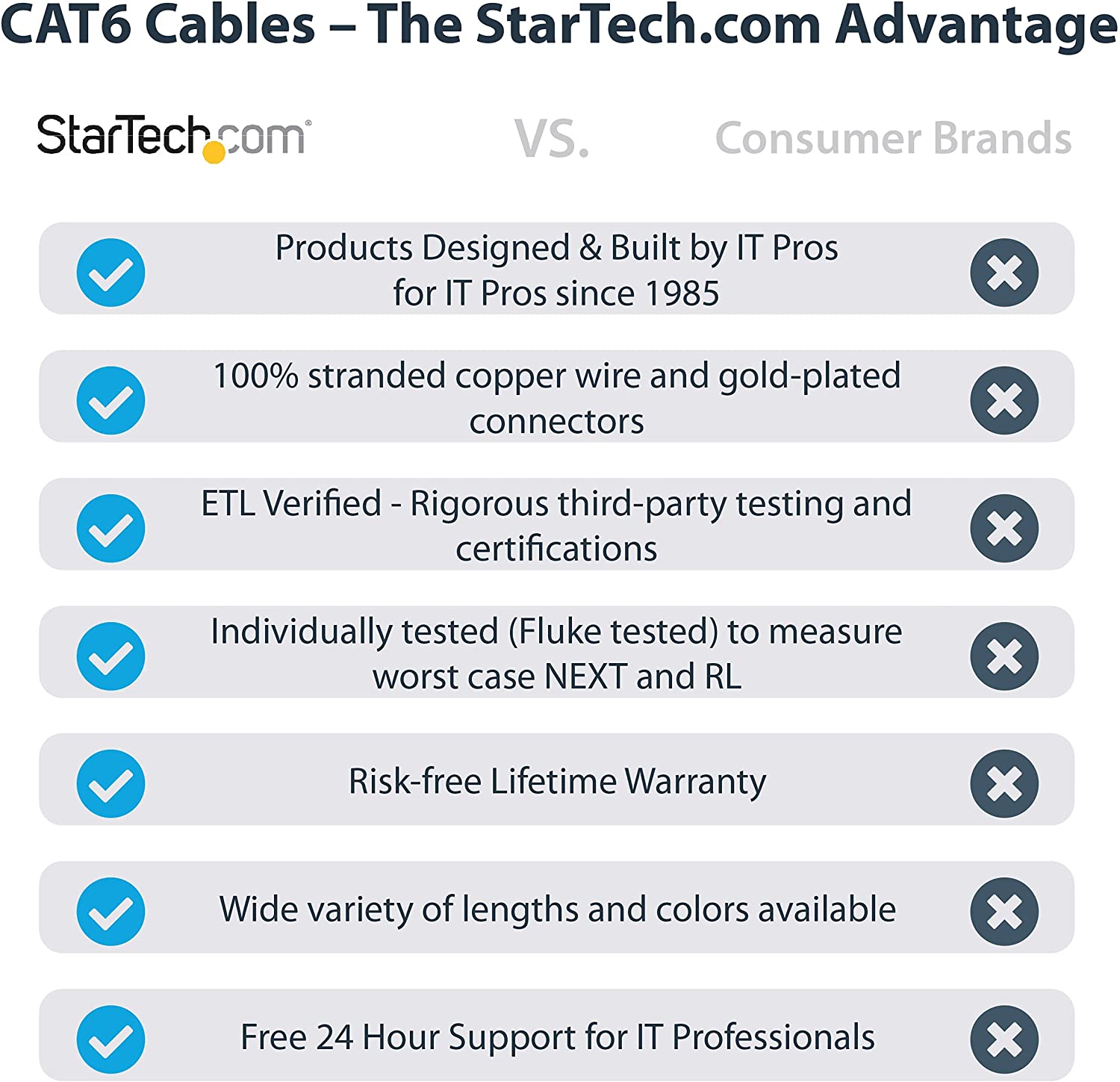 This Cat6 cable delivers reliable Gigabit network connections, which ensures high-performance capability for your demanding Ethernet applications. Find the length and color you need This 14-foot black patch cable is perfect for standard applications such as connecting from a wall jack to your laptop docking station or desktop computer. For easier network installations, our Cat6 patch cables are available in a wide variety of lengths and colors. This ensures you have the right size of cable available when you need it and it lets you color code your connections for a more organized setup. Snagless RJ45 clips help protect your network connections For trouble-free cable runs, this durable cable features snagless connectors that protect the RJ45 clips during installation, making them less likely to snag or break. The cable also features molded boots which offer connector strain relief by stopping the RJ45 connector termination points from bending at sharp angles. This reduces the risk of damage to the cable, which could decrease network connectivity and performance. 100% copper for outstanding value Get the highest value for your cable investment with our Cat6 Ethernet cables. Each of our patch cables is manufactured using high-quality copper conductors and they are carefully constructed and tested, to keep Near-End Crosstalk (NEXT) well within acceptable limits. 24-gauge wire for high-performance network connections Ensure high-performance capability for your demanding Ethernet applications, such as Power-over-Ethernet and 4K or 1080p video streaming, using cables that include 24 AWG copper. 50-micron gold connectors provide peak conductivity You can rely on our RJ45 connectors to deliver optimum conductivity while eliminating signal loss due to oxidation or corrosion. The N6PATCH14BK is backed by StarTech..