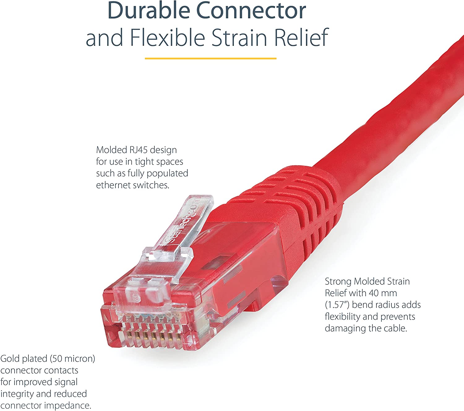 50 Mikron vergoldete Kontakte. Dieses geformte Patchkabel bietet hochwertige Stecker aus 50 Mikron Gold, um optimale Leitfähigkeit zu bieten und Signalverlust durch Oxidation oder Korrosion zu vermeiden.