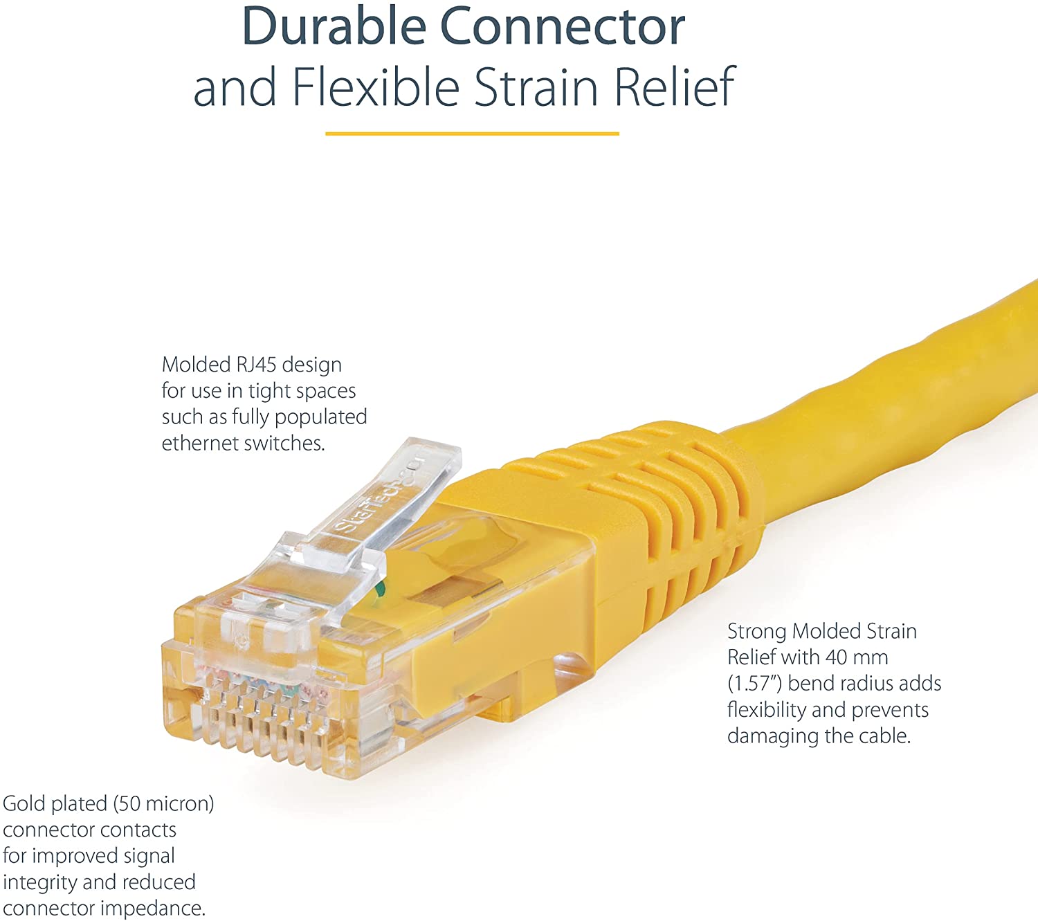 StarTech.'s Category 6 cables are the perfect way to connect your workspace's emerging gigabit works. Category 6 cables improve upon the Category 5e specification by providing twice the available bandwidth (up to 500Mhz) and a signal-to-noise margin improvement that is sixteen times (12dB) better than that provided by Cat 5e.Primary InformationNetwork Cable Type : Patch Cable Left Connector Gender : Male Right Connector Gender : Male Left Connector Type : RJ-45 Right Connector Type : RJ-45 Networking / Compliant Standards : TIA/EIA-568B Category 6 Features : Molded Dimensions&MiscellaneousLength : 15 feet Enclosure Color : Yellow Service&SupportService & Support Type : Lifetime warranty Special FeatureRoHS : Y UNSPSC CodeUNSPSC Code : 26121609