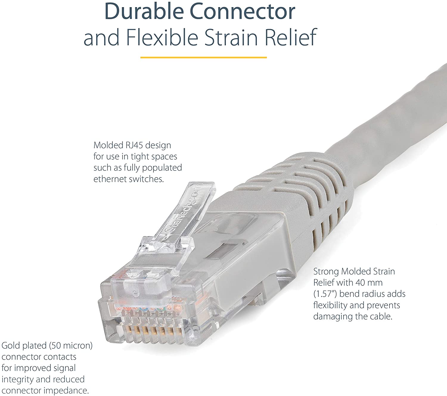 make Power-over-ethernet-capable Gigabit Network Connections. The C6patch1gr Cat 6 Patch Cable (1 Ft) Meets Or Exceeds All Category 6 Cable Specifications To Ensure Reliable Gigabit Network Connections, And Features A Durable Gray Pvc Jacket That Enables You To Color Code Your Network Cable Runs As Needed. To Ensure Long-lasting Performance, This High Quality Cat 6 Patch Cable Features Molded Pvc Strain Relief That Prevents The Rj45 Connector Termination Points From Bending At Sharp Angles - Reducing The Risk Of Cable Damage, Which Could Decrease Network Performance. Constructed Of Only Top Quality Materials, This Gigabit Patch Cable Delivers Reliable Performance And Is Backed By Our Lifetime Warranty. 100% Copper - A Better Value Startech.com Cat6 Cables Are Manufactured Using High-quality Copper Conductors. While Many Cable Manufacturers Offer A cheaper Cable, Based On A Copper-coated Aluminum Core, We Make No Compromises On Quality To Ensure You Receive Top Value And Performance For Your Network Cable Investment. 24 Awg Wire This Cat6 Cable Is Constructed With 24 Gauge Copper Wire, To Support A Broad Range Of Ethernet Applications Such As Power Over Ethernet (poe). Because We Use A High Quality Copper Wire, Our Cables Easily Sustain The Power Required For Power Over Ethernet Applications, Whereas The Inferior Quality Offered By Copper-coated Aluminum Cables May Be Subject To Insufficient Power Delivery, Heat Buildup, Equipment Damage And Potentially, Fire. 50-micron Gold Connectors This Molded Patch Cable Offers High Quality Connectors Comprised Of 50-micron Gold, To Deliver Optimum Conductivity While Eliminating Signal Loss Due To Oxidation Or Corrosion.