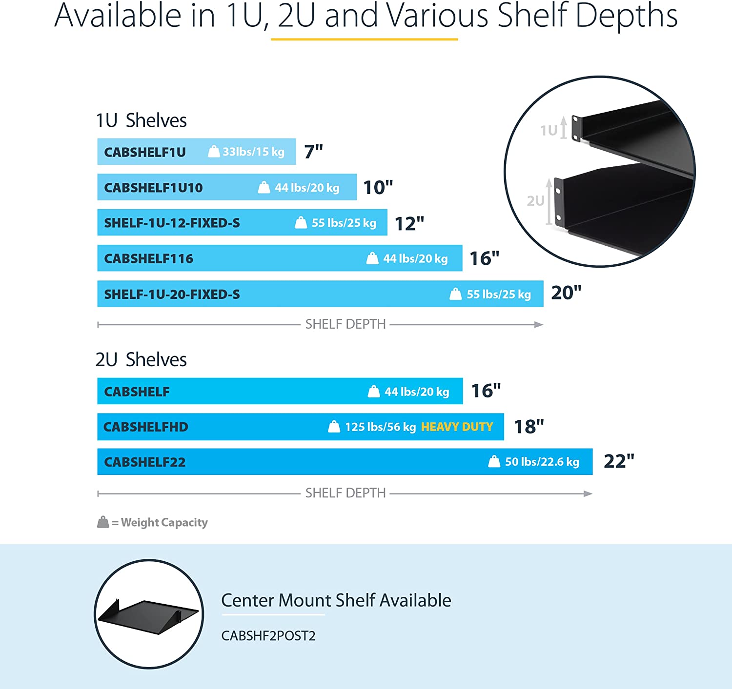 StarTech.com 1U Fixed Server Rack Mount Shelf - 10in Deep Steel Universal Cantilever Tray For 19" AV/ Network Equipment Rack - Heavy Duty Steel - Weight Capacity 44lbs/20kg, Black (CABSHELF1U10) 10" Depth 1U Rack Shelf is backordered and will ship as soon as it is back in stock.