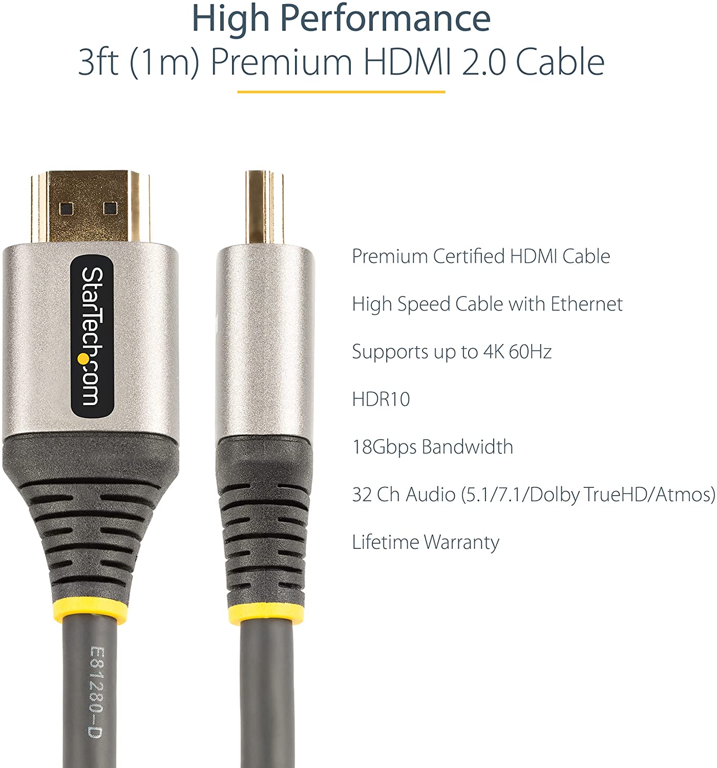 StarTech.com 3ft (1m) Premium Certified HDMI 2.0 Cable - High Speed Ultra HD 4K 60Hz HDMI Cable with Ethernet - HDR10, ARC - UHD HDMI Video Cord - for UHD Monitors, TVs, Displays - M/M (HDMMV1M) 3.3 ft / 1 m
