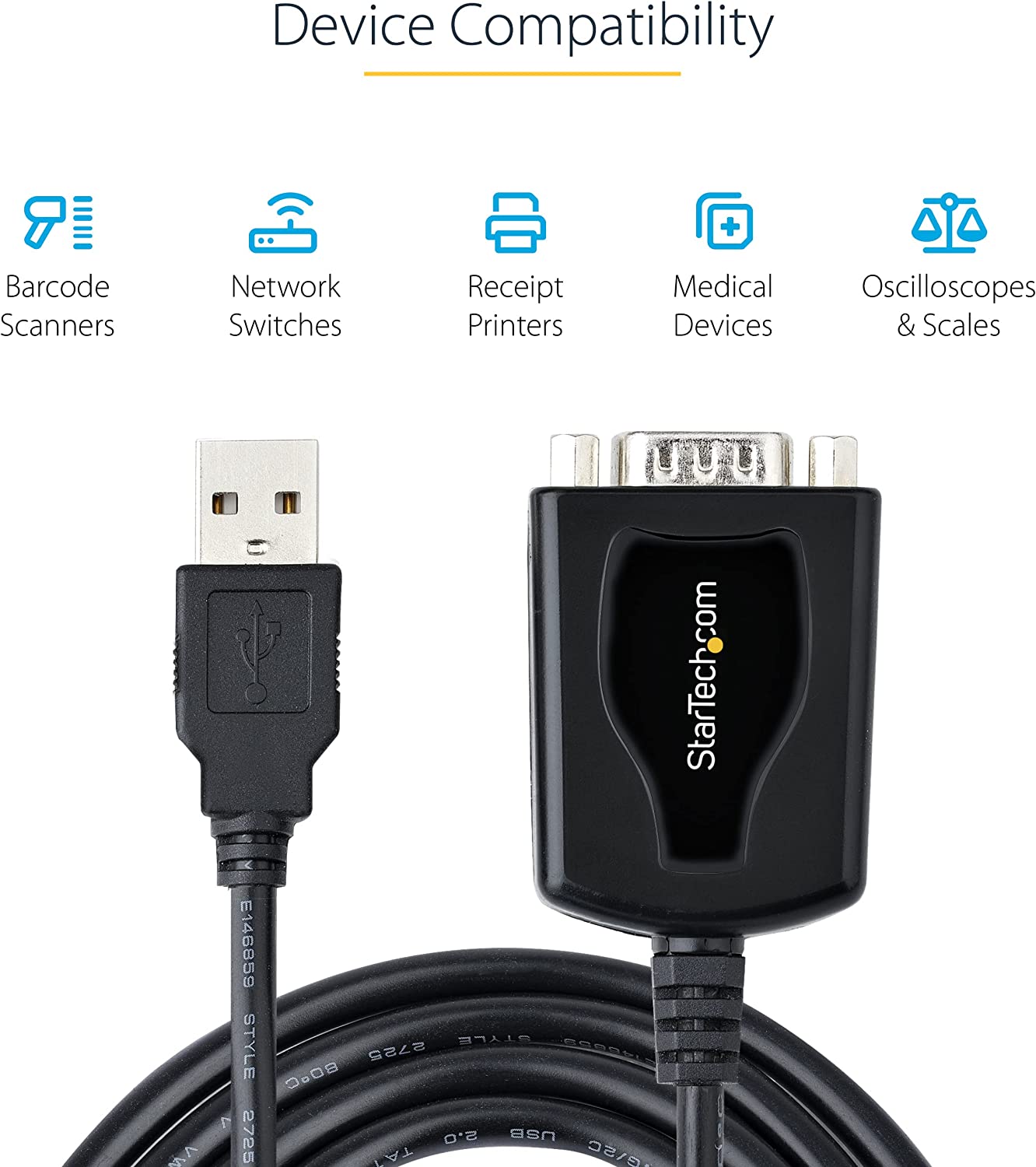 StarTech.com 3ft (1m) USB to Serial Cable with COM Port Retention, DB9 Male RS232 to USB Converter, USB to Serial Adapter for PLC/Printer/Scanner, Prolific Chipset, Windows/Mac (1P3FPC-USB-SERIAL) is backordered and will ship as soon as it is back in stock.