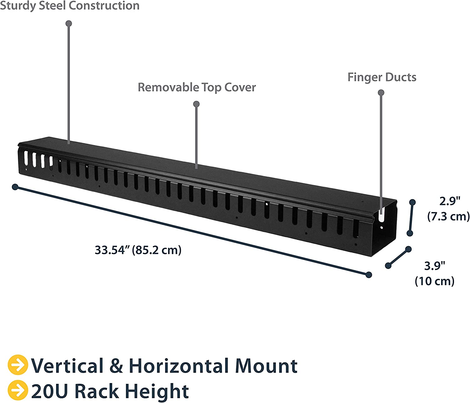 Este gerenciador de cabos vertical de 91 cm oferece uma maneira simples e eficiente de organizar os cabos no rack do servidor. Você pode fixar o gerenciador de cabos verticalmente em seu rack para guiar perfeitamente os cabos entre equipamentos que estão montados em diferentes alturas. O gerenciador de cabos 0U oferece opções de instalação versáteis e é compatível com a maioria dos suportes que são 20U ou maiores. O painel possui um design 0U que não ocupa nenhum espaço de montagem e, com instalação simples sem ferramentas, é fácil de fixar ou reposicionar conforme necessário. Melhore a aparência e acessibilidade do seu rack. O gerenciador de cabos vertical usa um método de gerenciamento de cabos de duto de dedo, que inclui um painel de cobertura que esconde perfeitamente os cabos que estão passando por ele. O gerenciador de cabos funciona verticalmente ao longo da lateral do seu rack para guiar perfeitamente os cabos entre equipamentos montados em diferentes alturas. Isso oferece uma maneira organizada e bem organizada de executar cabos desde dispositivos montados até a parte inferior do seu rack até outros dispositivos montados perto da parte superior, sem deixar uma bagunça de cabos pendurados no meio. Ter cabos organizados e roteados não apenas melhora a aparência e acessibilidade do seu rack, também facilita a instalação, acesso e manutenção dos componentes do rack. Compatibilidade sem complicações com o seu rack para máxima compatibilidade com praticamente qualquer rack de servidor, você pode instalar o painel de gerenciamento de cabos usando furos de montagem que são comumente encontrados na maioria dos equipamentos de rack. O método de montagem sem ferramentas fixa o painel de gerenciamento de cabos aos orifícios de montagem em forma de fechadura que são embutidos em seu suporte.
