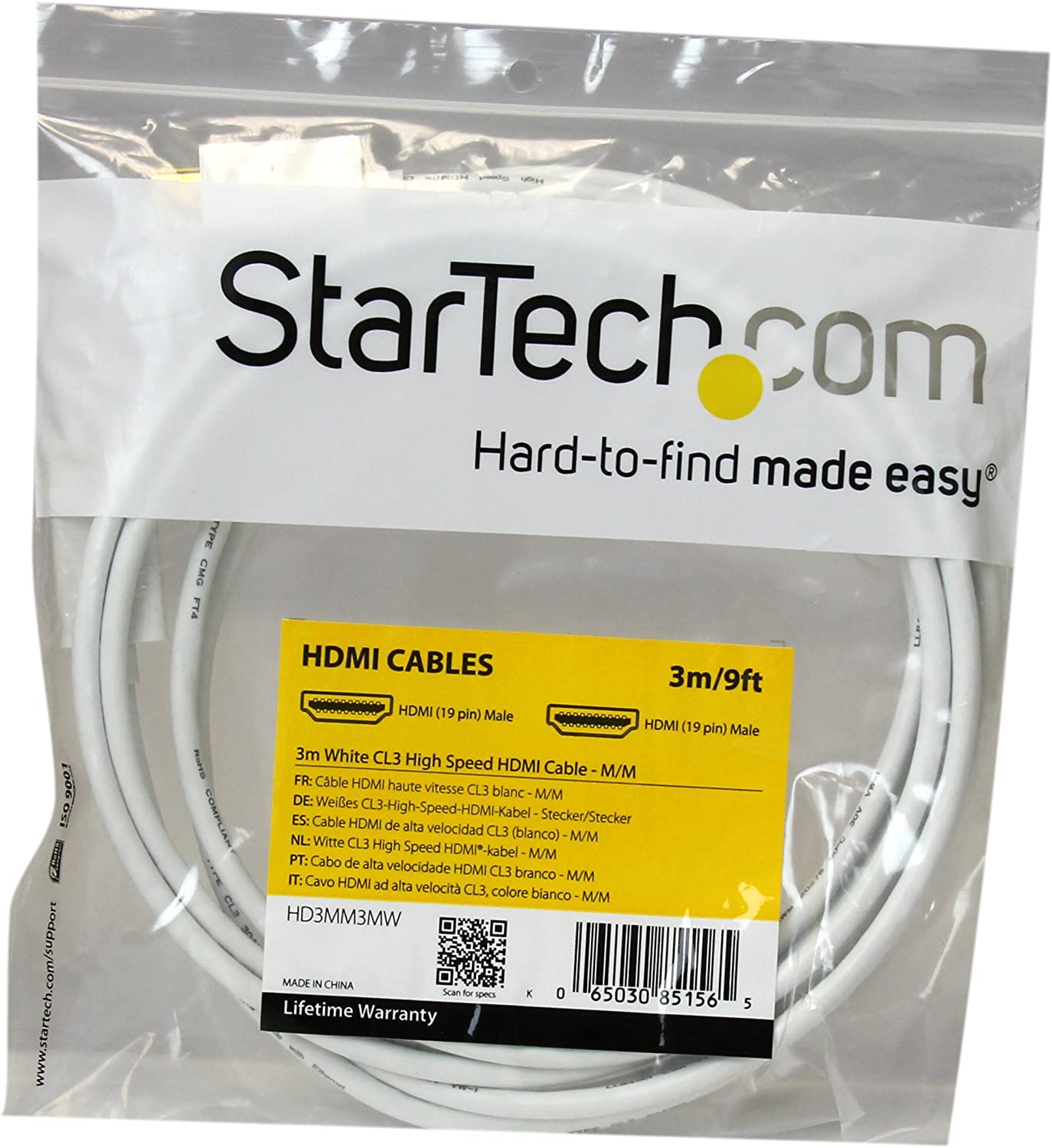 StarTech.com 3m / 10 ft CL3 Rated HDMI Cable w/ Ethernet - In Wall Rated Ultra HD HDMI Cable - 4K 30Hz UHD High Speed HDMI Cable - 10.2 Gbps - HDMI 1.4 Video/Display Cable - 30AWG, White (HD3MM3MW) 10 ft/3 m
