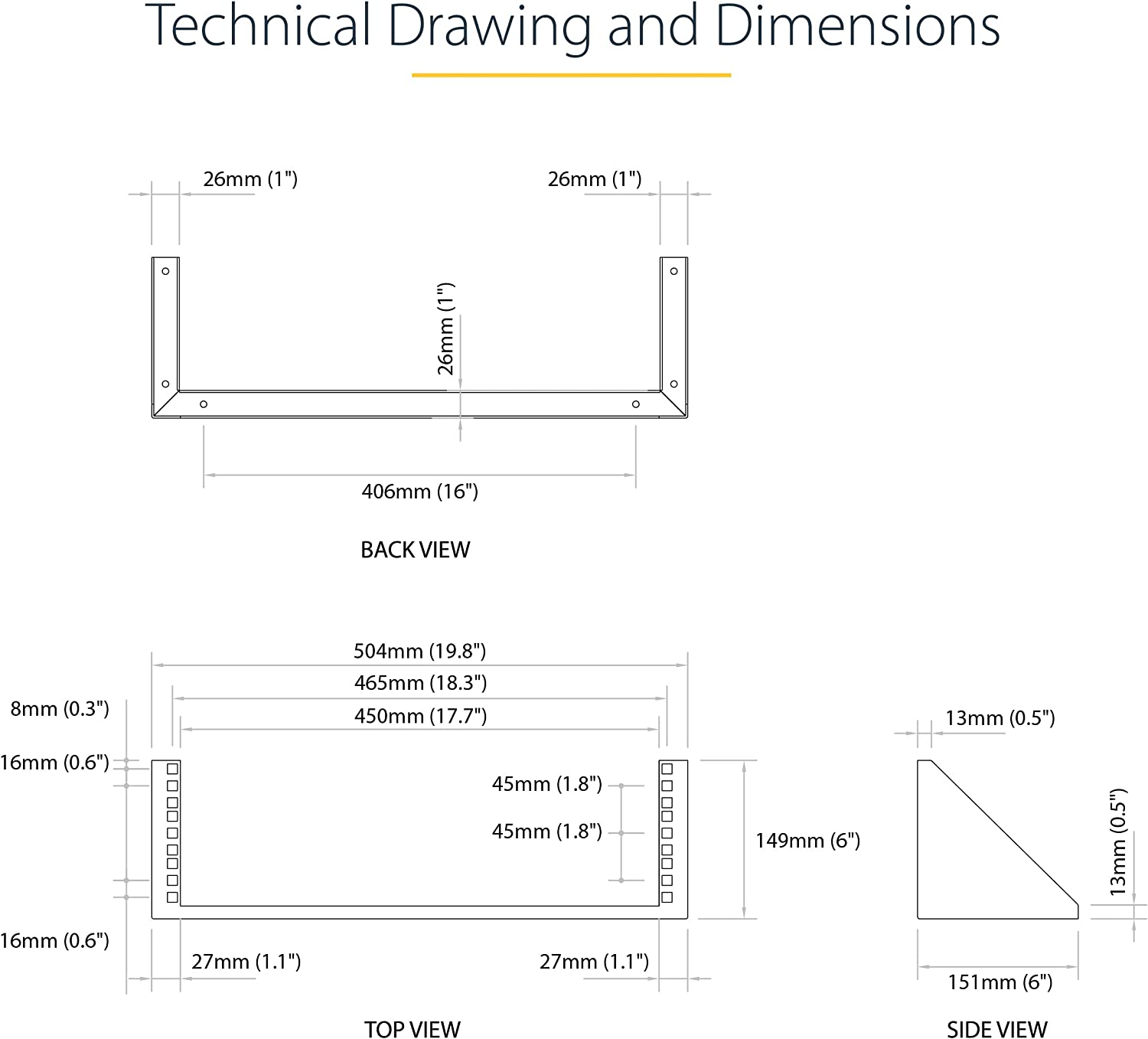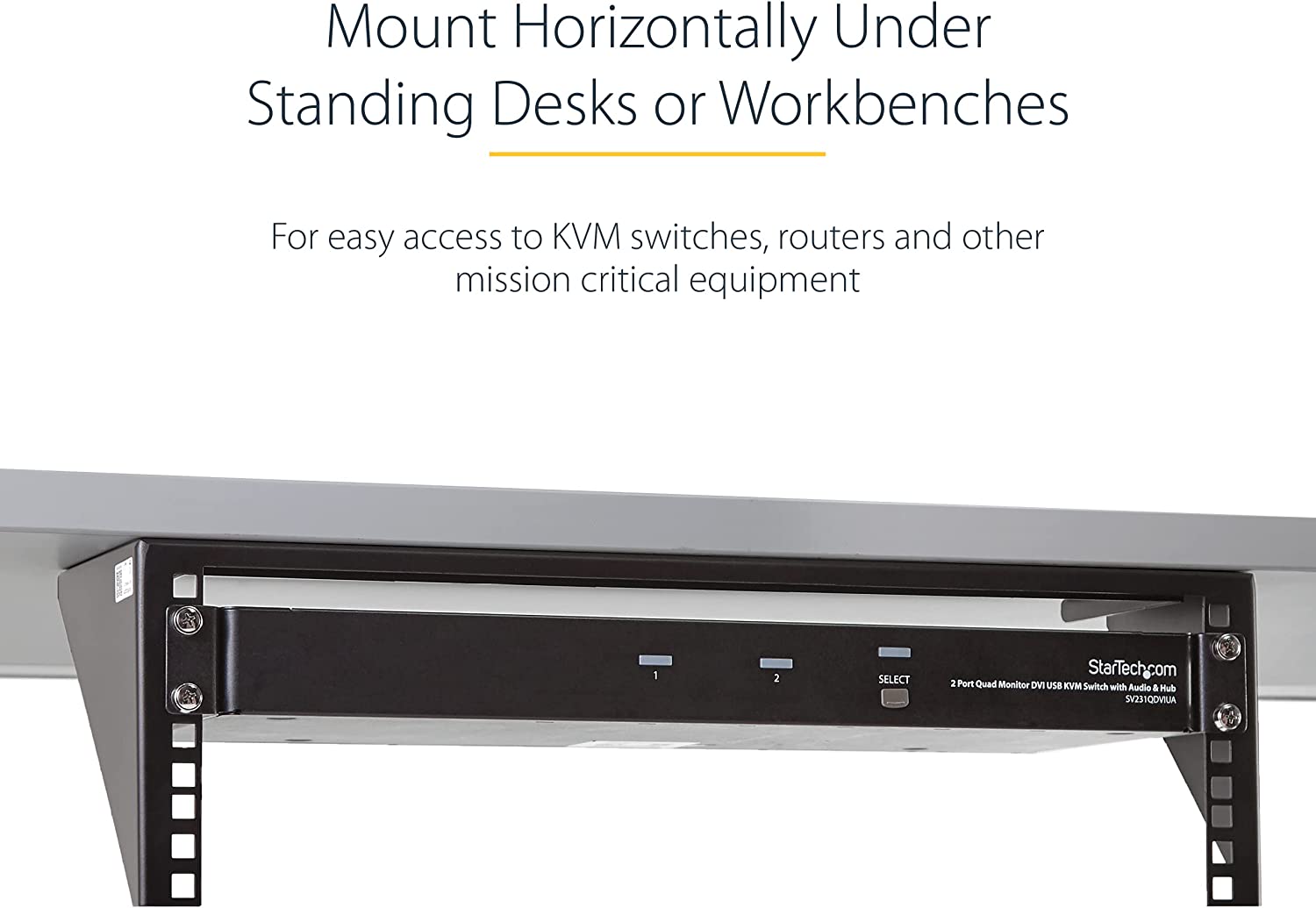 Features: Constructed to meet the EIA-310 19" rack standards Arrives fully assembled with cage screws and nuts for mounting equipment into the rack Equipment can be vertically wall mounted, or horizontally under a desk Compatible with most 19" rack mountable equipment Made from solid steel for durability Wall mounting holes are 16" center to center for greater stability, and mounting to standard wall studs