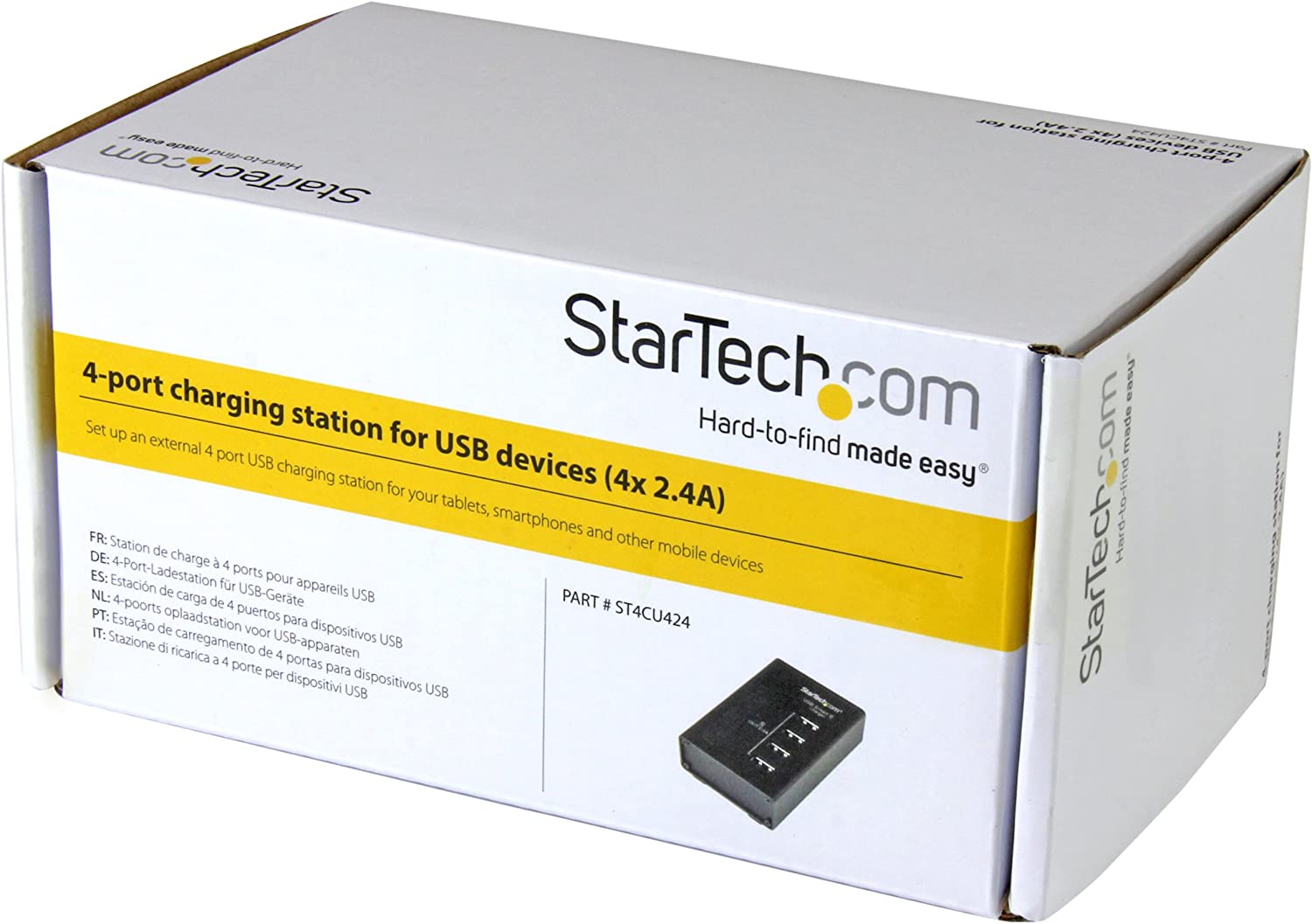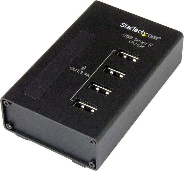Set up an external 4 port USB charging station for your tablets, smartphones and other mobile devices, this USB charging station offers a high-powered solution for keeping your mobile devices powered and ready for use. It's compatible with a wide range of tablets and smartphones, and features built-in safety measures to help protect against damage to your mobile devices. High-Powered charging the charging station can deliver 48 watts of power in total, providing 2.4 Amps of power per port. That means you can charge four tablets at once, and every port can provide the power each device needs. One charger for all of your mobile devices the charger supports USB battery charging specification 1.2, Which ensures compatibility with a broad range of mobile devices, including the apple iPhone and iPad, the Microsoft surface tablet, the Samsung galaxy tab, android devices and more. Dedicated charging station this all-in-one charger is perfect for charging multiple devices during meetings in a boardroom or conference room. It gives you and your co-workers access to charging when it's needed. The compact, metal enclosure is extremely durable and offers an integrated on/off power button that turns all ports on and off for simple operation. For added flexibility, the charge station includes a bracket for wall-mounted installations. Protection for your devices the USB charging station features built-in safety measures to ensure that all of your devices are protected against damage from overheating, overvoltage, overcurrent or short circuiting. If the 48-watt limit is exceeded, the power being sent to the connected devices will turn off and the charger will reset itself until the load is reduced to safe levels. The charger also includes an led indicator beside each port to notify you of a short circuit, while the affected port will shut down until you power-cycle the charger. The st4cu424 is backed by StarTech.com's 2-Year warranty and free lifetime technical support.