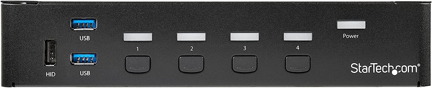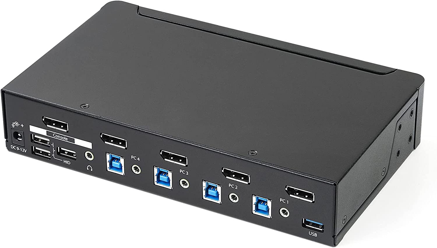 This 4 Port DisplayPort KVM switch lets you control four DisplayPort (DP) computers with a single monitor, keyboard and mouse. The KVM also features 3.5 mm audio and a built-in 3-port USB 3.0 hub. This DP KVM switch offers a built-in 3-port USB 3.0 hub that's separate from your HID keyboard and mouse, so you can share USB peripheral devices between each connected computer. The USB 3.0 hub automatically switches your connected USB devices to the selected computer, saving you the hassle of disconnecting and reconnecting your peripherals.With support for USB 3.0, you can achieve data transfer rates up to 5Gbps on this computer monitor switch box. Offering support for resolutions up to Ultra HD 4K at 30Hz, this 4 port DisplayPort KVM switch has the ability to drive large DP displays with ease, making it ideal for graphical applications that require high-resolution video support. The USB 3.0 KVM switch features auxiliary 3.5 mm audio ports that enable you to share independent analog audio, from each of your connected computers, with your desktop speaker set. Independent audio, along with 4K DP video, gives you full multimedia control between different computers, making this keyboard mouse monitor switch perfect for creative professional applications such as video and sound design or editing.The 4K DisplayPort KVM switch is backed by a StarTech.com 2-year warranty with free lifetime technical support.