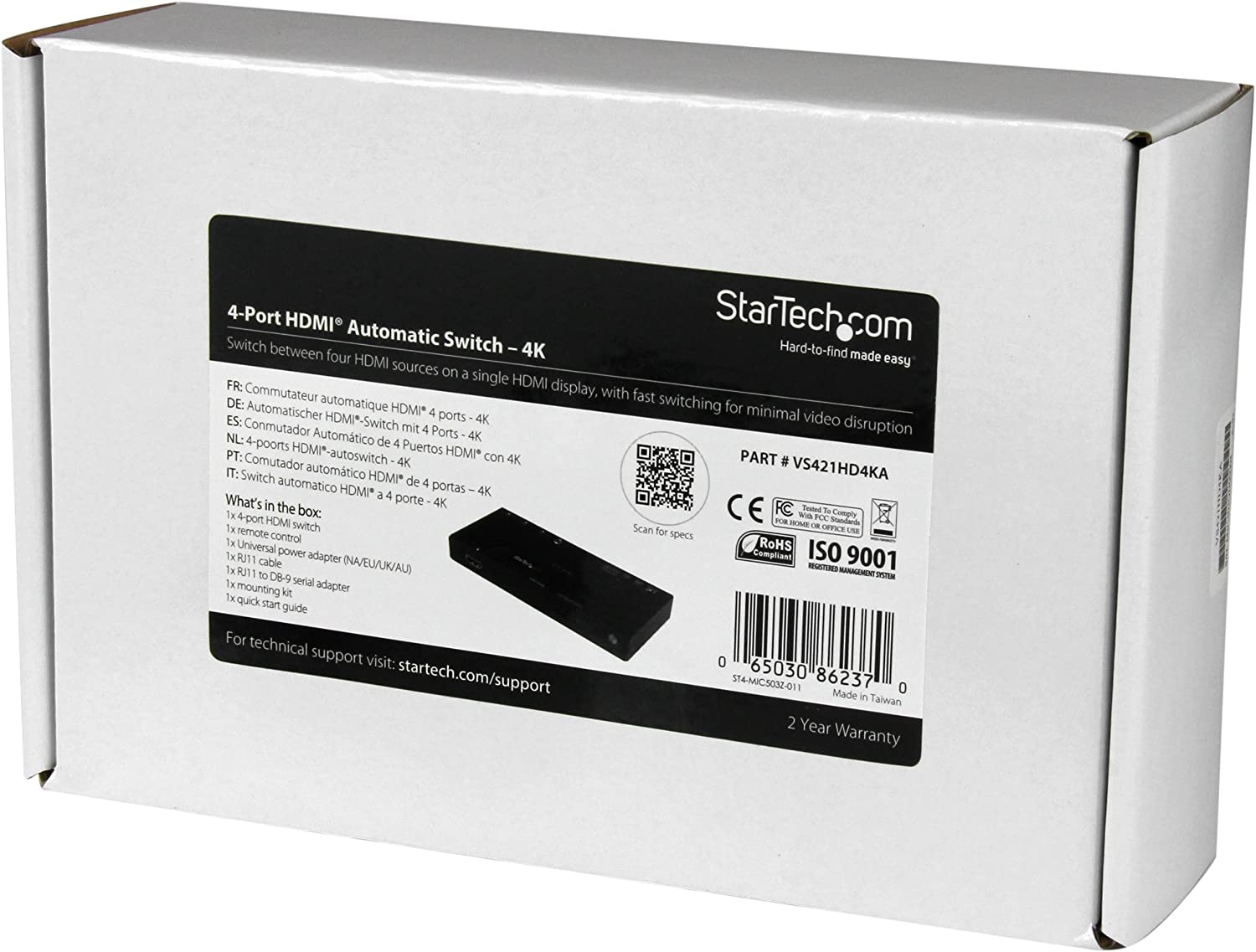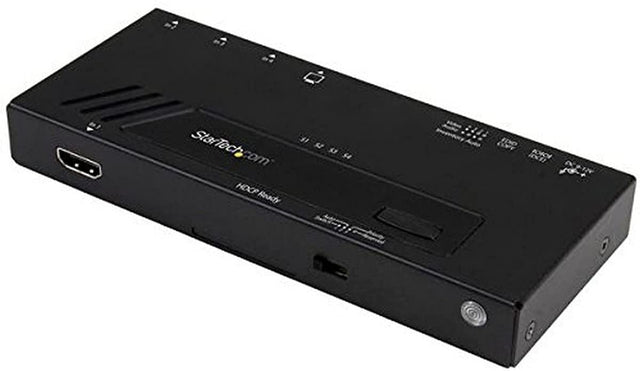 The StarTech VS421HD4KA 4-port HDMI automatic video switch allows switching between four 4K video sources seamlessly and lets you share a monitor, projector or TV with that sources. The 4 port 4K2K switch efficiently routes four HDMI sources to one HDMI display. It offers visual experience for audiences in a wide range of venues like conference centers, boardrooms, educational facilities and commercial settings. The EDID copy support of this switch assures accurate display output. It comes with a remote control, universal power adapter, RJ11 cable, RJ11 to DB-9 serial adapter, mounting kit and quick start guide. . Automatic video switch is suitable for A/V receiver, blu-ray disc player, computer, display, DVD player, gaming console, projector, set-top box. Dimensions: 0.8"H x 6.1"W x 2.6"D. Comes in black color. Number of ports: four HDMI in (19 pin) female, one HDMI out (19 pin) female, one RJ-11 Female. Audio specifications: 7.1 surround sound. Supported resolutions: 3840 x 2160 (4K), 2560 x 1600, 1920 x 1200, 1920 x 1080 (1080p), 1280 x 720 (720p), Digital resolutions: 4K at 30 Hz. Power supply: 100 - 240 VAC input voltage, 12 VDC output voltage, 1.5 A output current. LED status indicator: four active port LED, one power LED. Temperature: 32 - 104 deg F operating, 14 - 140 deg F storage, Humidity: 0 - 80% operating. The four port 4K2K switch routes four HDMI sources to one HDMI display effectively. EDID copy support assures accurate display output. Contains remote control, universal power adapter (NA/EU/UK/AU), RJ11 cable, RJ11 to DB-9 serial adapter, mounting kit, quick start guide. Meets CE, FCC, RoHS certifications and standards. Weight: 10.5 oz. Comes with 2 years warranty.