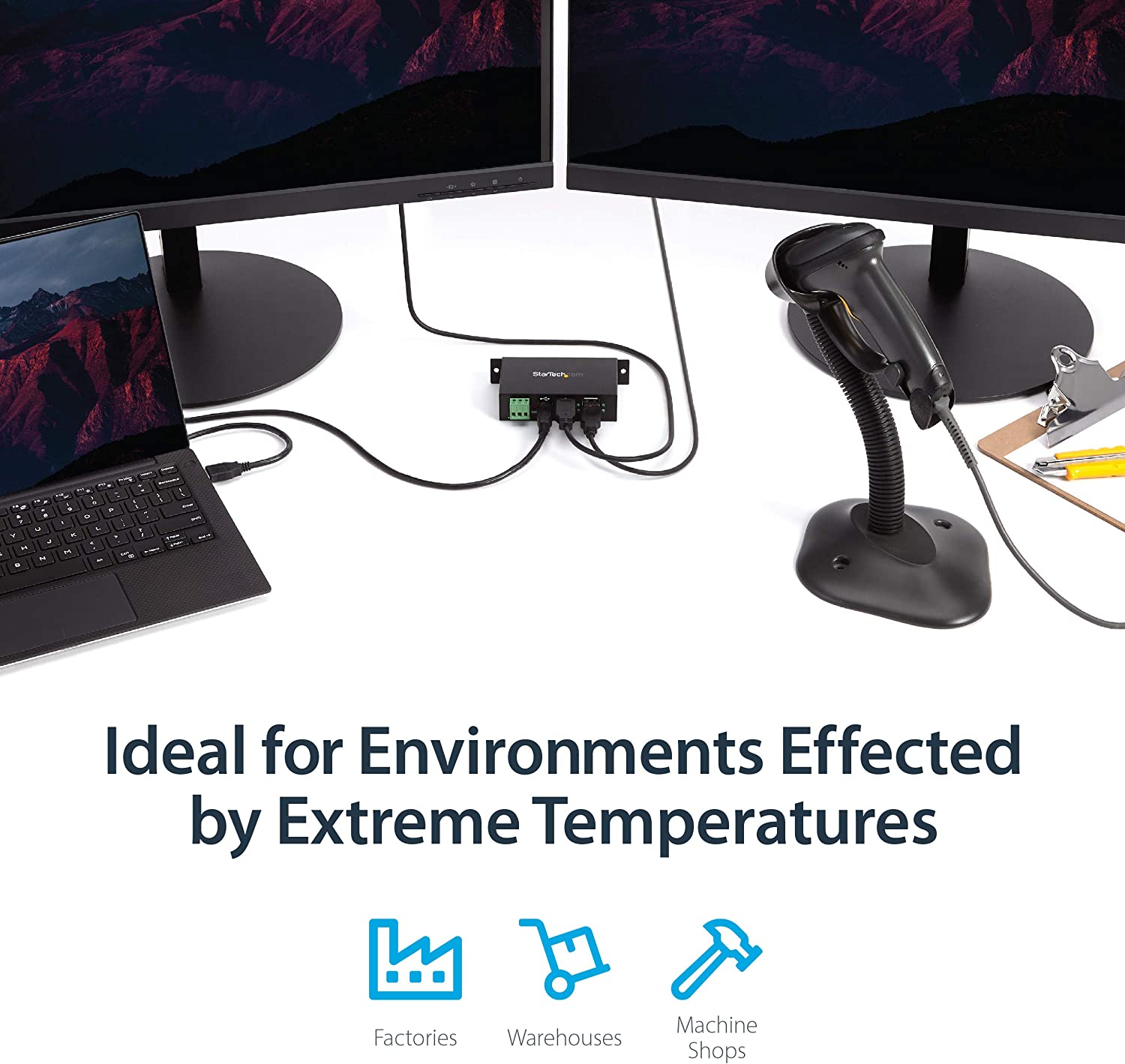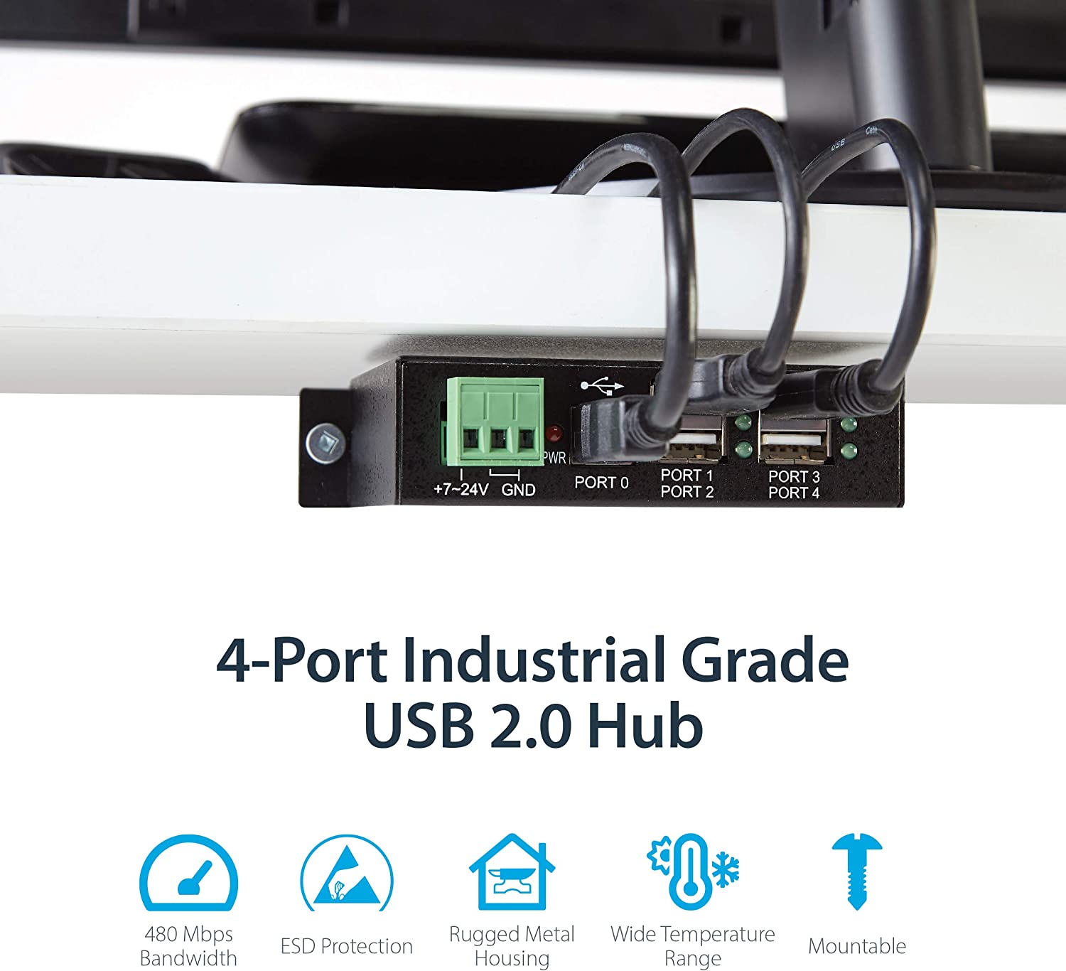 Perfect for factory environments, therugged hubalso supports a wide operating temperature range (0°C to 55°C) and offers ESD protection to each USB port, which can help prevent damage to your connected devices.