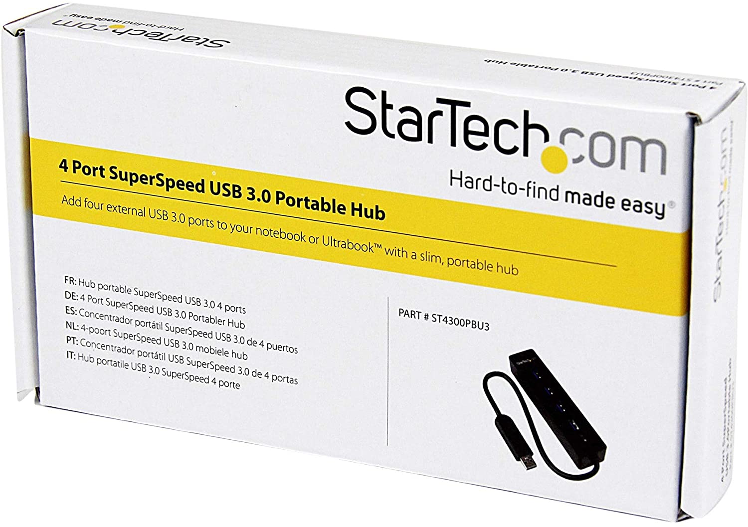 The hub features a built-in, 25 cm (10 in) cable that is longer than what most traditional hubs offer. The extended-length cable gives you the flexibility to place the hub and your devices exactly where you want them, and it ensures the hub can connect to your laptop or tablet regardless of where the laptop’s USB 3.0 port is located. Expand the connectivity of your laptop when you travel This portable USB 3.0 hub is great for adding extra ports to your laptop, tablet, Microsoft Surface Pro 4, Surface Book, and other Microsoft Surface products. With an integrated cable you have more flexibility to place the hub on your desk as desired. Plus, the hub is USB-powered for easy transport when you travel. Upright port-configuration saves desk space This USB hub offers a block-style design with ports placed across the top surface of the hub. With upright port access your connected devices (for example, flash drives and mouse and keyboard wireless receivers) take up less desk space. Alternatively, you can lay the hub on its side for easy cable connections to devices like external hard drivers or printers. Designed for easy use With its compact design, you can easily position the USB 3.0 (also known as USB 3.1 Gen 1) hub on your desk or workspace to make your USB devices more accessible. There’s also ample space between the USB 3.0 ports, so it’s easy to plug and unplug the devices you use the most. The USB 3.0 hub is natively supported in virtually all operating systems, which makes for an easy setup with no driver installation required. And because it’s backward compatible, you can connect both new and legacy USB devices (for example USB 2.0 peripherals). The ST4300PBU3 is backed by a StarTech..