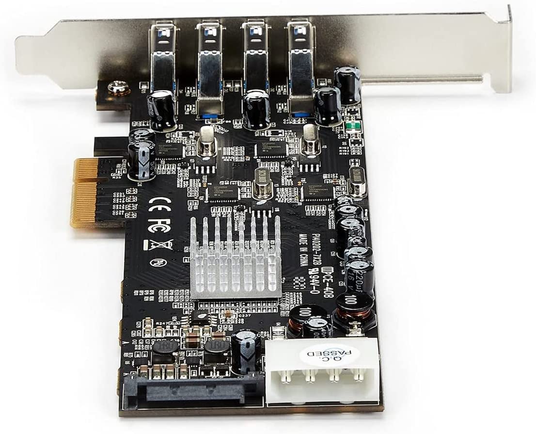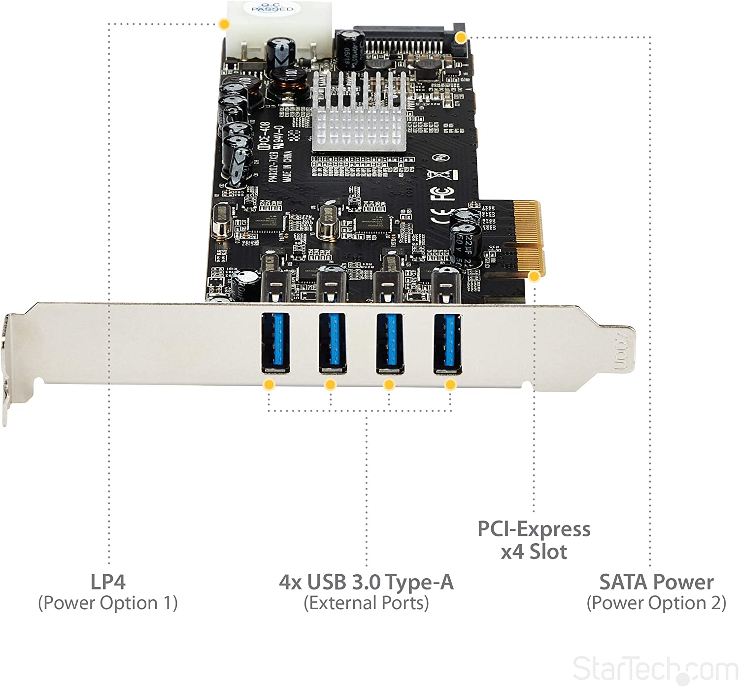 Expand the USB Capabilities of Your System This 4 port USB 3.0 PCIe card lets you add four dedicated 5Gbps USB 3.0 ports to the internal PCI Express slot on your PCIe enabled PC. This independent port architecture improves USB 3.0 performance by transferring data on four individual channels to your computer, giving you faster transfers. Increase Performance with UASP Enhanced with UASP support (USB Attached SCSI Protocol), this PCIe to USB adapter card performs up to 70% faster than conventional USB 3.0, when paired with a UASP supported enclosure. (Note: UASP requires a compatible operating system). Maximize Your Power For high-power USB devices, this PCIe USB 3.0 card includes an optional SATA or LP4 power connector to connect to your system power supply and deliver up to 900mA of power per port to USB 3.0 bus-powered devices (500mA for USB 2.0). This USB 3.0 add on card also supports USB Battery Charging Specification 1.2 (Apple Mode only), letting you charge compatible Apple devices (iPhones and iPads) faster than using a standard USB 3.0 port. This USB 3.0 expansion card is backward compatible with existing USB 2.0 / 1.1 devices. For added versatility, the card is equipped with a standard-profile bracket and includes a low-profile (half-height) bracket for installation in small form-factor computers. This USB 3.0 PCI Express card hub is backed by a StarTech..