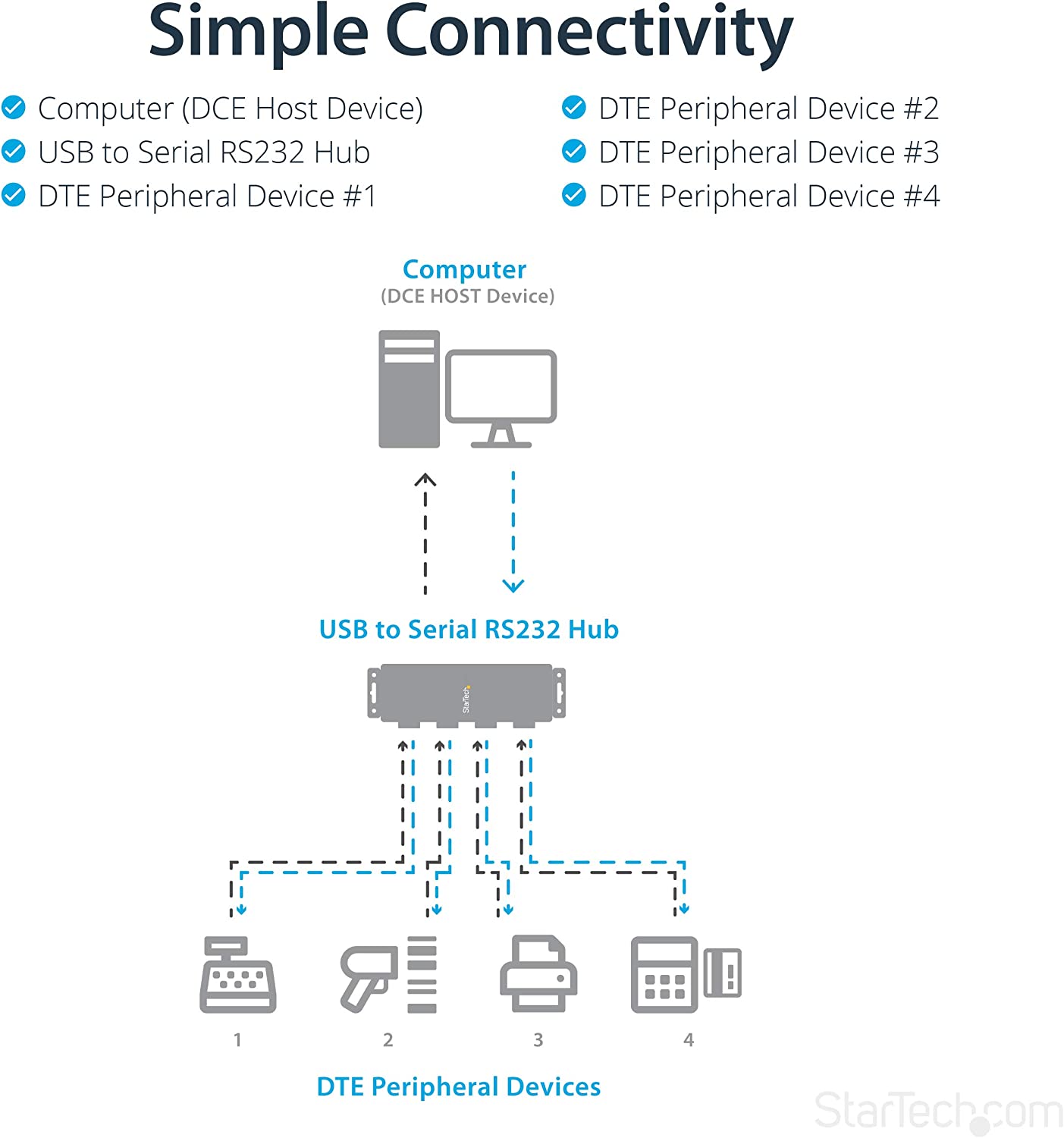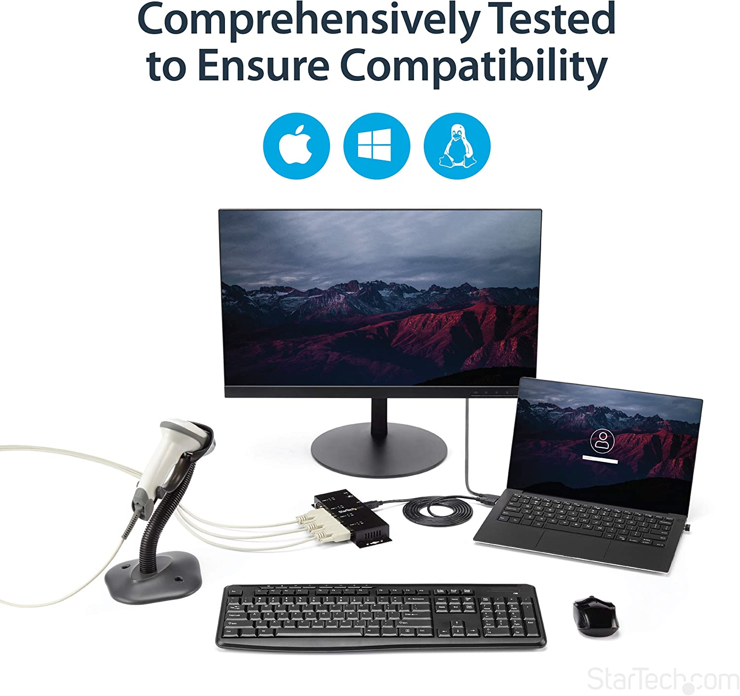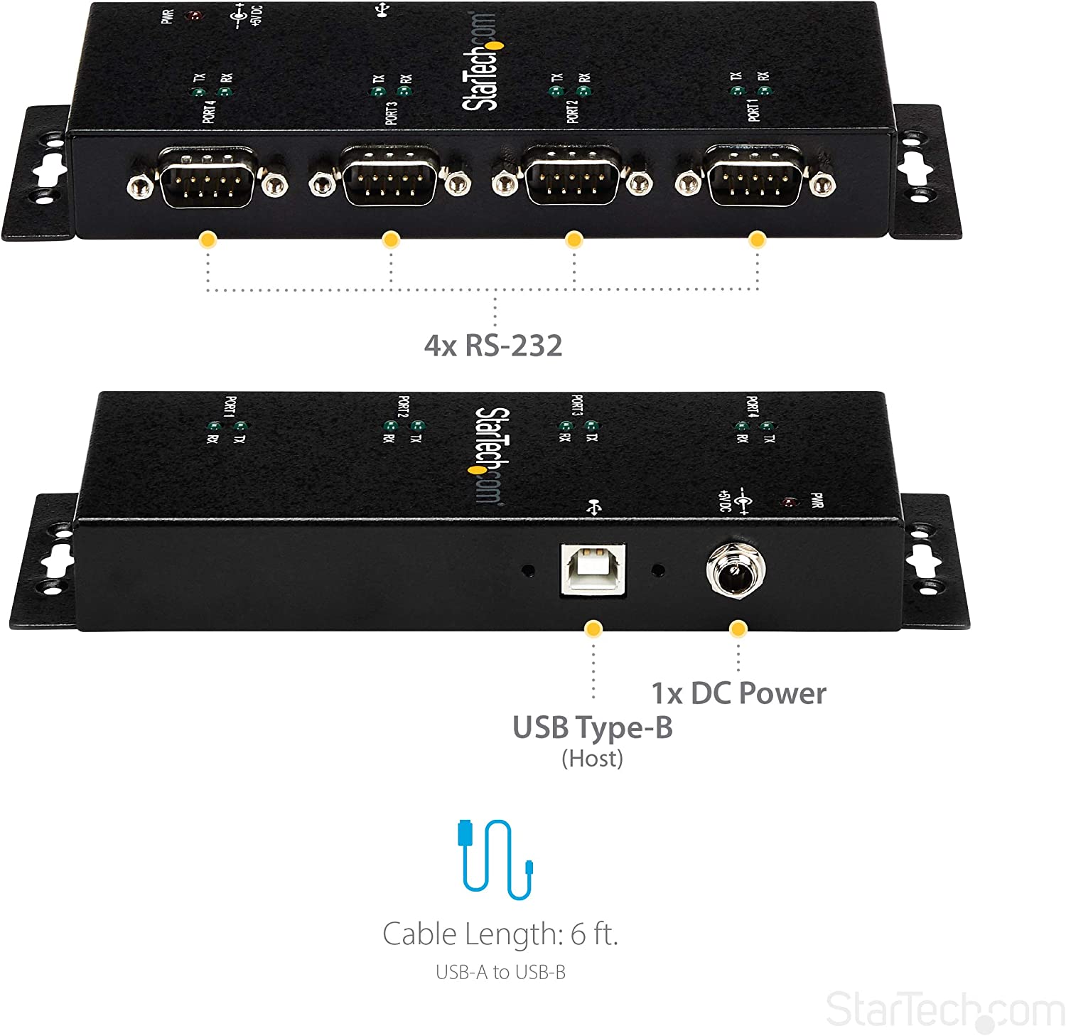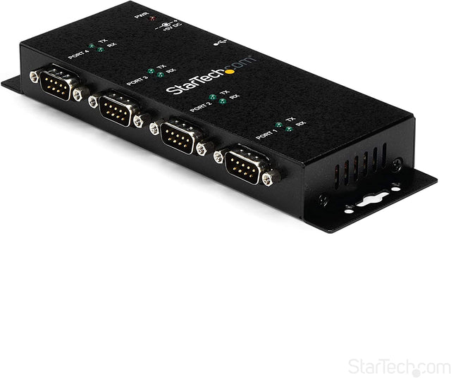 This industrial 4 port USB to serial RS232 adapter with DIN rail clips converts a single USB port into four RS232 serial ports, enabling you to connect to, monitor and control your serial devices. Built for Industrial Environments Featuring rugged metal construction, with sturdy wall-mounting brackets and top-hat DIN rail clips (included), this FTDI USB to DB9 RS232 hub provides versatile mounting options and a robust solution for both harsh industrial environments and simple desktop installations. Convenient COM Port Retention This USB powered DB9 serial converter also retains assigned serial COM port values once connected, allowing the same values to be automatically reassigned to the USB serial hub ports. Versatile Functionality Designed to be versatile, this USB to serial adapter cable is perfect for IT administrators looking to add legacy functionality to newer notebooks, PCs and servers that lack an integrated RS232 port. It can also be used for connecting, monitoring and controlling industrial/automotive sensors and equipment, as well as connecting bar code scanners, receipt printers and other point of sale devices. This 4 port USB to serial RS232 adapter is backed by a StarTech..