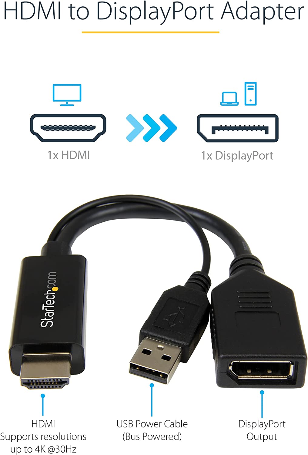 StarTech.com 4K 30Hz HDMI to DisplayPort Video Adapter w/ USB Power - 6 in - HDMI 1.4 (Male) to DP 1.2 (Female) Active Monitor Converter (HD2DP) HDMI to DisplayPort - 4K30 with USB Power