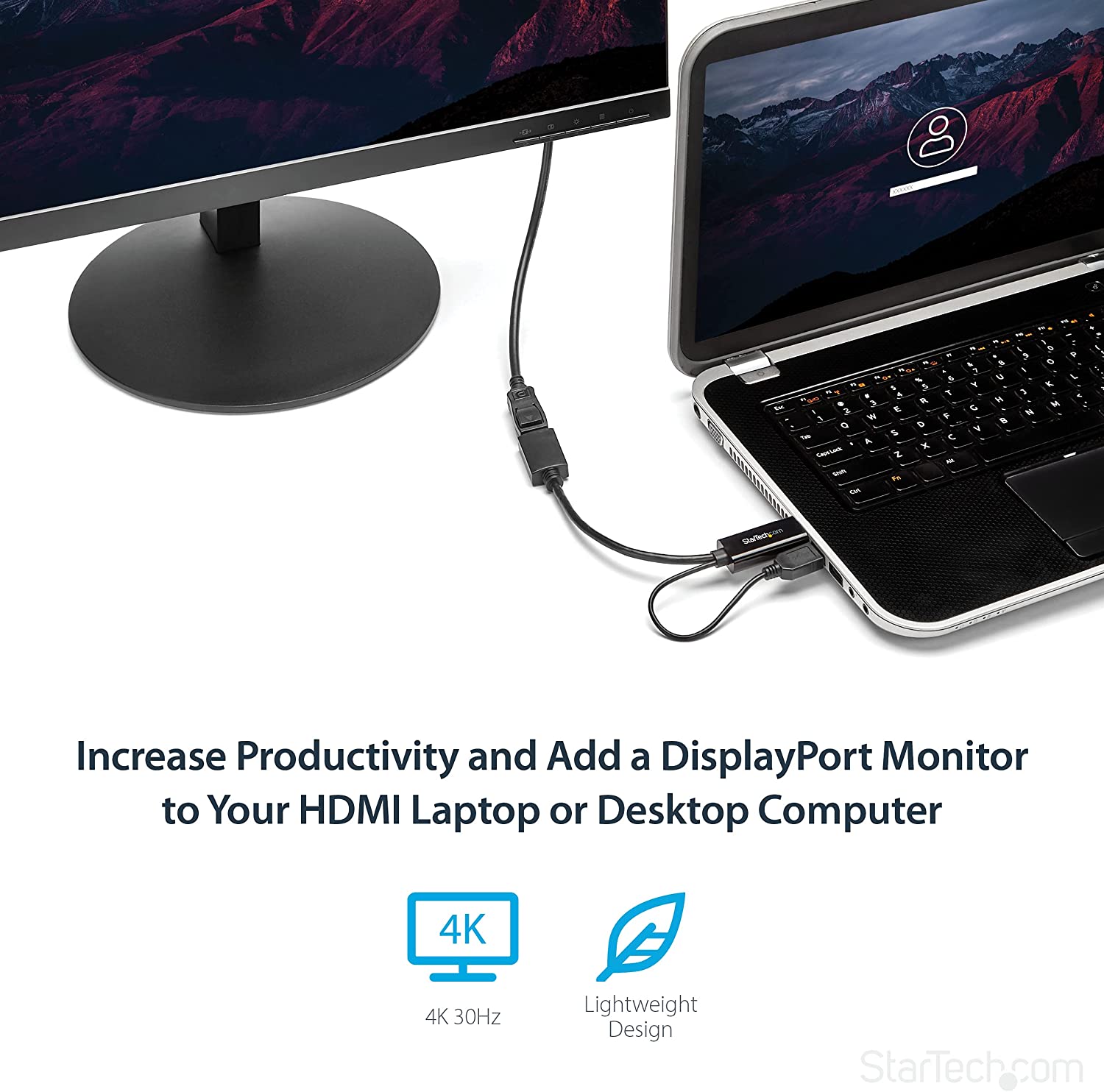 This HDMI to DisplayPort video adapter with USB power lets you connect an HDMI (male) video source, such as your laptop, desktop, Blu-ray player, or camera, to a DisplayPort (female) monitor or projector. Be More Productive This active HDMI to DP adapter offers plug-and-play installation, providing a hassle-free setup with no software or drivers to install. The converter uses a USB port for power, avoiding the need for an extra power adapter. It also features a compact design that requires very little space at your workstation. The HDMI to DP adapter lets you add a second monitor or display to your laptop, providing the additional screen space you need to multitask more efficiently and accomplish more in the same amount of time. It offers a definite productivity boost, and lets you view documents, spreadsheets, and web pages across multiple screens. Enjoy Ultra HD Picture Quality With support for 4K at 30Hz, you get a sharp, crisp picture that’s richer and more true-to-life than traditional HD, with far greater detail. The 4K HDMI to DP adapter delivers Ultra HD content to your DisplayPort monitor and supports widescreen video, as well as 7.1 channel surround audio. The adapter is backward compatible with lower resolutions, including 1080p, which makes it a great accessory for home, office or other workspace applications. This HDMI 1.4 to DisplayPort 1.2 video converter is backed by a StarTech..