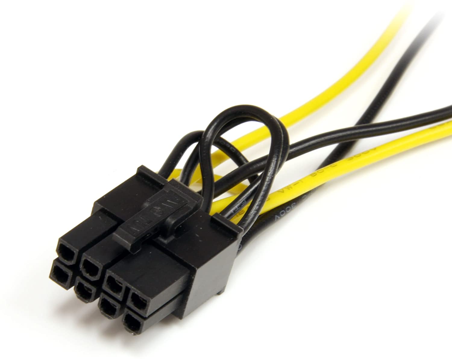The Startech SATA Power to 8-Pin PCI Express Video Card Power Cable Adapter features a PCI Express power connector as well as two 15-pin SATA male power connectors. This provides a cost-effective way to connect a PCIe video card to Serial ATA power connectors provided by the computer power supply, eliminating the need to upgrade the power supply for the sake of video card compatibility. It's expertly designed and constructed of top quality materials.Startech SATA Power to 8-Pin PCI Express Video Card Power Cable Adapter:1 x 8-pin PCI Express (female) connector to 2 x 15-pin SATA (male) connectorsGold-plated SATA connectorsLength: 6"