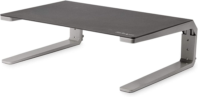 Create a more ergonomic workspace. This strong and sturdy monitor riser stand lifts your display off of your desk for more comfortable viewing, helping to prevent neck strain. Its attractive silver and black design adds to the aesthetic appeal of your workspace, and creates storage space underneath. Elevate your display to position your monitor. You can customize the height of the computer monitor riser, adjusting easily to three different heights: 4.9", 5.9" or 6.9" (12.5, 15 or 17.5 cm) off the desk surface. With a robust 10.5" x 16" steel surface area and an aluminum base, the monitor riser provides a stable platform for a monitor up to 32" with maximum weight capacity of up to 22 lb. (10 kg). You can also use it for your laptop. The non-skid bottom surface of the feet provides a solid grip while protecting your desk surface from scratches and scuff-marks. It's ideal for a variety of desk surfaces including glass-top desks. Maximize your work space and create a clutter-free area. Store your mouse, phone, and other items underneath the monitor shelf so they are out of view, but not out of reach. You can also use the riser stand to raise your printer, freeing up desk or counter space underneath. The integrated cable management slots keep cables organized and out of view. With fast and easy setup, you'll be ready to work with the monitor riser within minutes. Raise your monitor to a comfortable viewing height with this monitor stands. Supports Up to 32" Monitors for versatile use. Made of Aluminum. Compatible with: standard VESA mounting patterns. Comes in gray. 5-year manufacturer limited warranty.