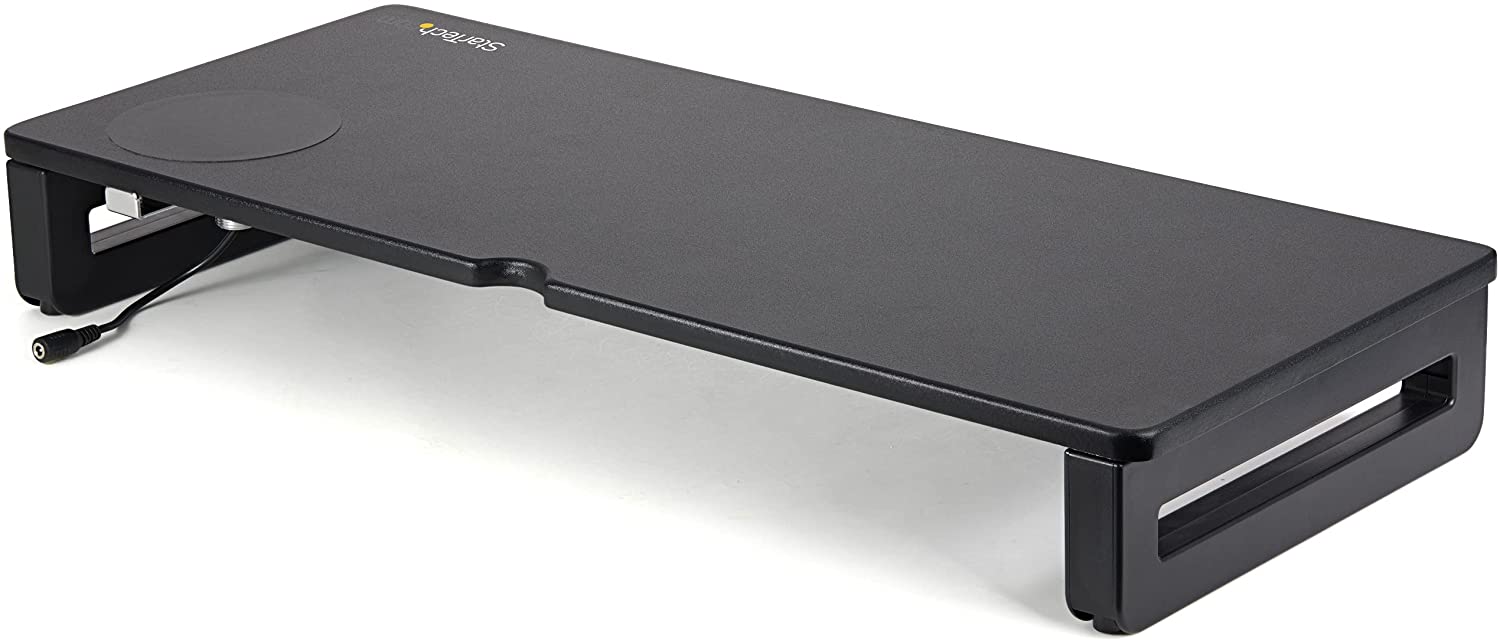 Raise your monitor to eye level for more comfortable viewing, while charging your mobile devices with the integrated wireless charging pad. This monitor riser stand also supports other types of devices like laptops or printers up to 33 lb. (15 kg) Avoiding Neck/Shoulder Strain while Saving Space This computer monitor stand enables you to easily increase the maximum height of your monitor by 3.3" or 4.6" from the desk surface, reducing neck/shoulder strain. With a mounting surface of 23.6 in (60 cm) x 9.8 in (25 cm), the monitor stand creates a storage area of 21" under the platform to store devices like your docking station, USB Hub, keyboard, or office supplies. Wirelessly Charge Your Mobile Devices Securely charge your smartphone or tablet with the integrated Qi™ Certified 15W wireless fast charging pad. The charging pad sits flush with the surface of the riser for a clean and sleek design. Protect Your Desk With the included rubber feet, your riser will stay in place and will ensure your desk surface is protected against scratches. MONSTADQI is backed by a StarTech..
