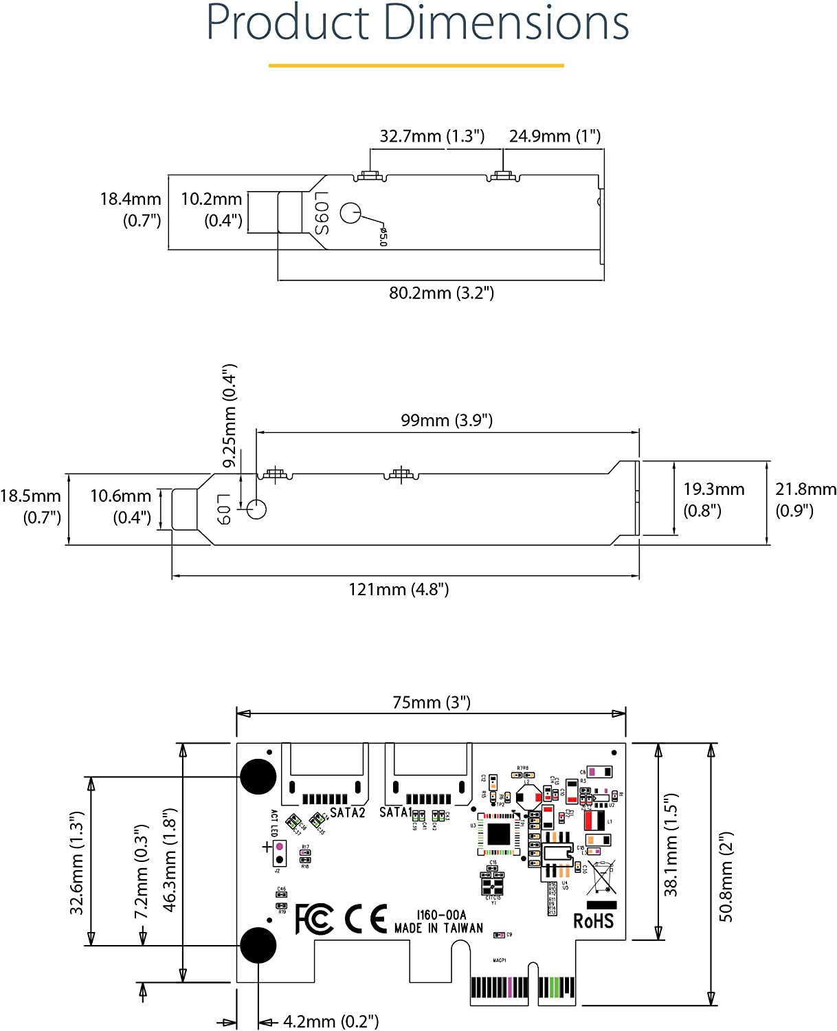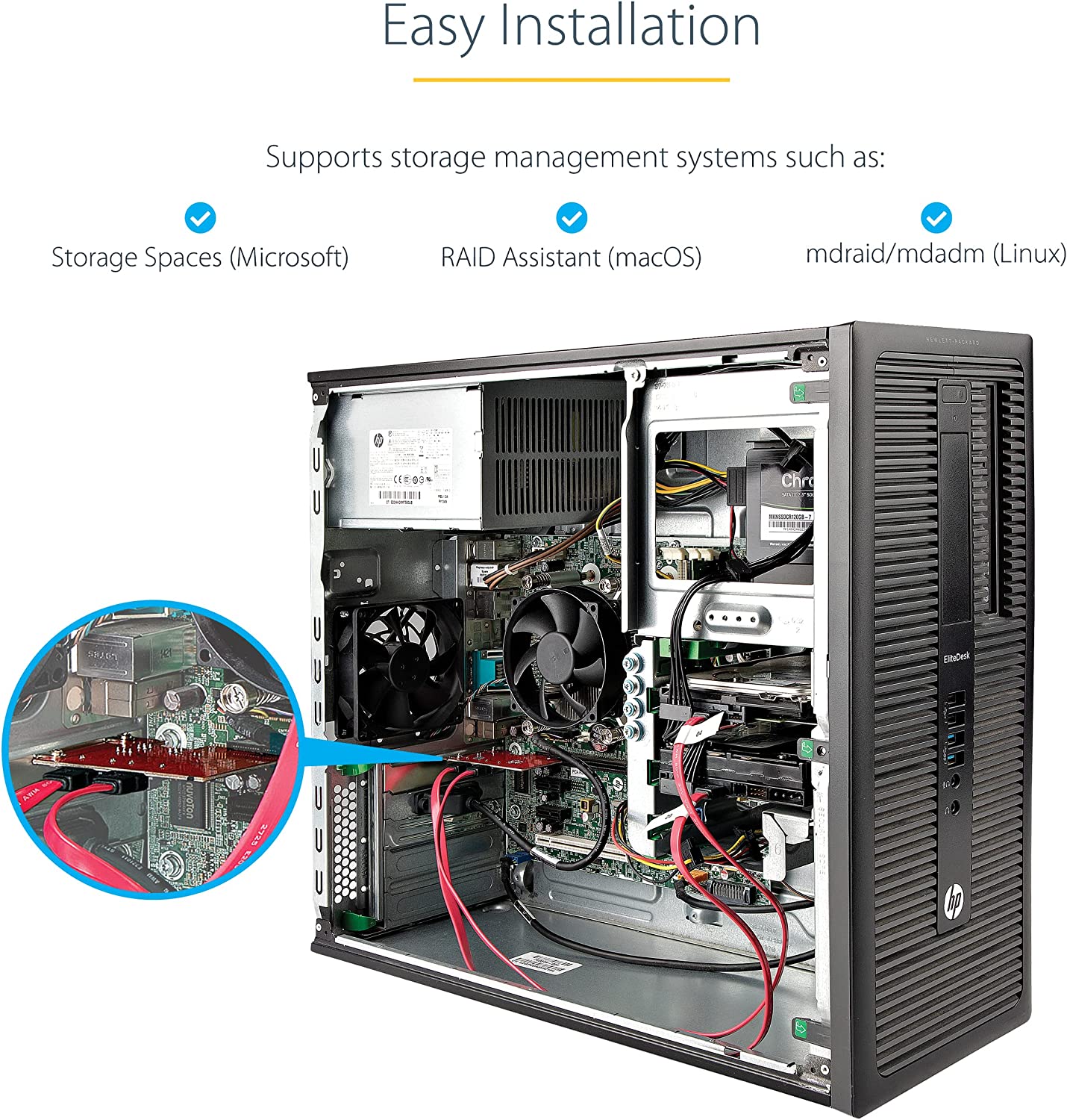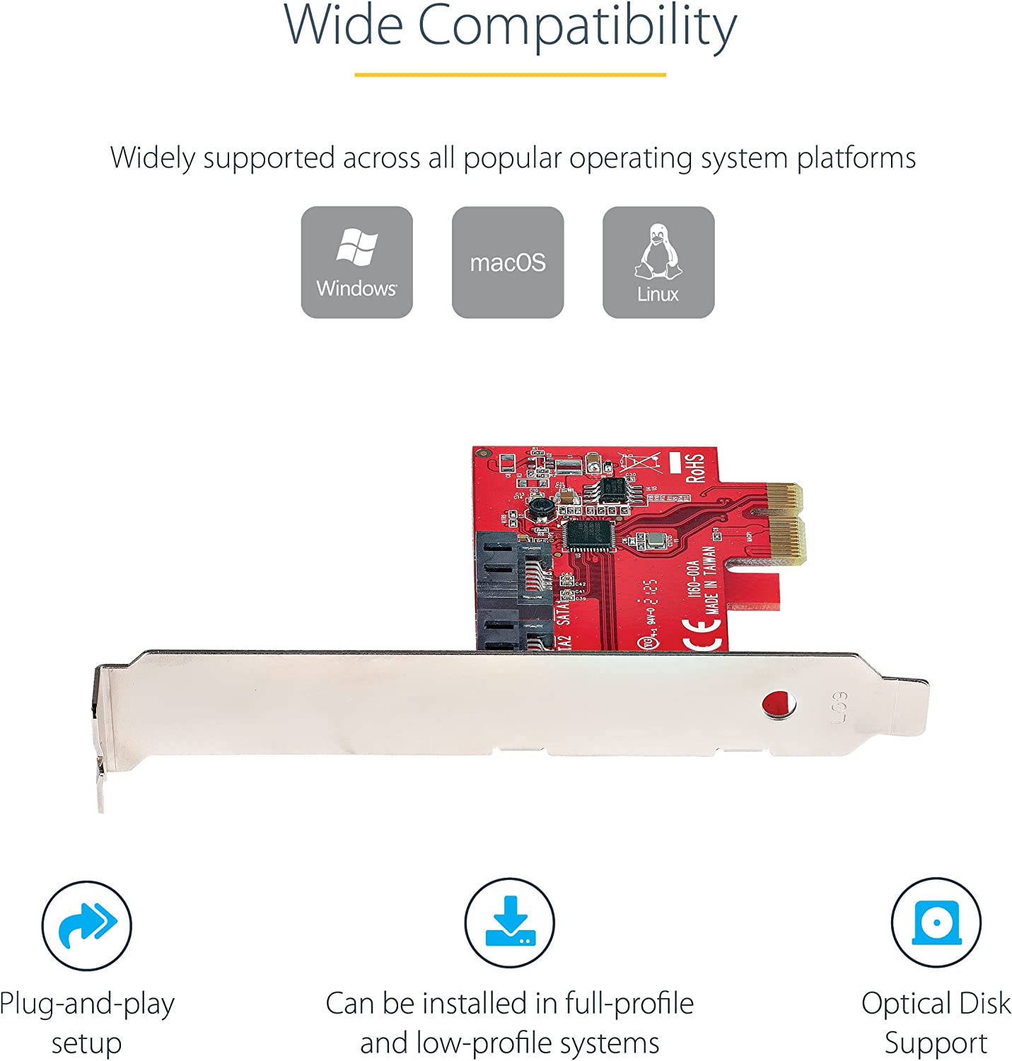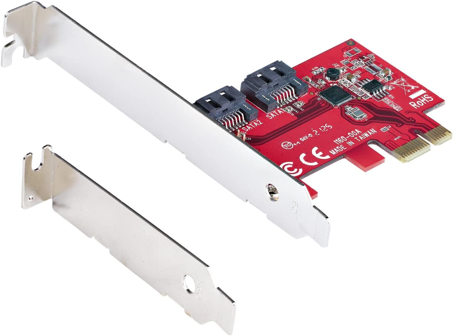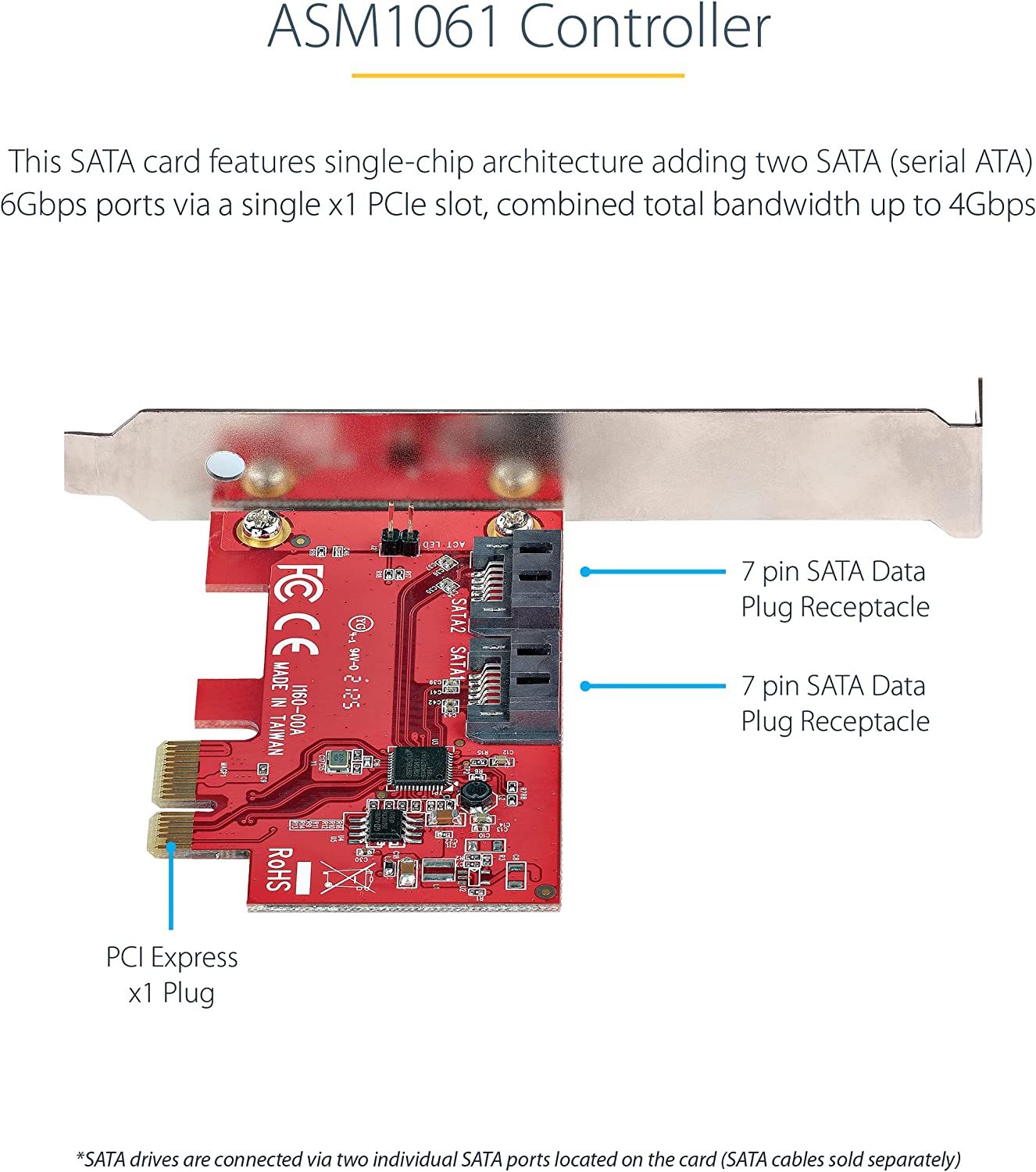 This 2-port SATA III (6Gbps) controller enables you to add two SATA 6Gbps Hard Drives (HDDs) or Solid State Drives (SSDs) to your computer system or server via an available PCIe x1 card slot. The card supports SATA III and PCI-Express 2.0 Specifications. ASM1061 to Deliver 2-Port SATA 6Gbps Performance Featuring the ASM1061 controller, this SATA card enables the connection of two high-performance SATA 6Gbps drives with a combined total throughput of up to 4Gbps. The SATA drives are connected via two individual SATA ports located on the card (SATA cables sold separately). Wide Compatibility The controller card is widely supported across all popular operating system platforms including Windows (7, 8, 10, 11), macOS (10.6.8 and above) and Linux (2.6.32 and above). The card also supports port multiplier, giving you the ability to connect multiple drives to a single SATA port (additional hardware required, sold separately). To further improve motherboard compatibility the card does not have a built-in RAID controller, but fully supports the use of software RAID. Plus, with support for PCIe 2.0 and SATA III Specifications this card ensures backward compatibility with previous generations (SATA I/II, PCIe 1) at lower performance. Hassle-Free Installation The SATA controller card features plug-and-play installation and can be installed in a full-profile or low-profile computer systems with the full-profile bracket preinstalled, and an interchangeable low-profile (half-height) bracket included. The card also supports storage software data management systems such as Storage Spaces (Microsoft), RAID Assistant (MacOS) and mdraid/mdadm (Linux), for hassle-free setup, partitioning and software RAID array building. 2P6G-PCIE-SATA-CARD is backed by a StarTech.com lifetime warranty and free lifetime 24/5 North American based, multi-lingual support. Manufacturer: StarTech.com. Manufact