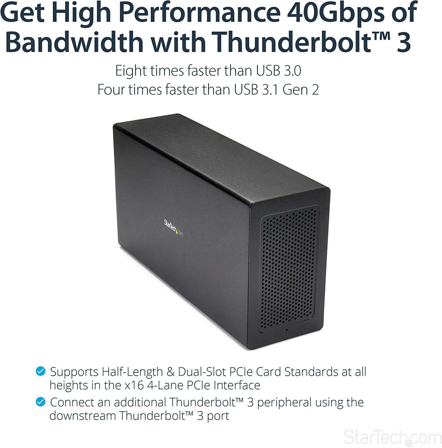 This Thunderbolt 3 PCIe expansion chassis lets you add an external PCIe x16 slot to your laptop or desktop computer, through an external Thunderbolt 3 connection. Expand the Capabilities of Your Thunderbolt 3 Computer This Thunderbolt 3 PCIe enclosure makes it easy to expand your system with the capabilities you need to work at peak productivity. You can add many types of PCIe cards or video capture cards. And, with the speed and bandwidth support of Thunderbolt 3 and PCIe 3.0, you can enjoy many of the same port additions you would from the PCIe expansion slots of a desktop system. Extend Your Workstation This external PCIe expansion box features a dedicated DisplayPort output that lets you add an additional display to your laptop or desktop computer. The PCIe enclosure features a second Thunderbolt 3 port, that you can use to connect a secondary display. With multiple extended displays, you can work more efficiently by multitasking faster, and avoid the hassle of continually repositioning several open programs. Increase Productivity At up to 40Gbps this Thunderbolt 3 expansion chassis gives you the throughput to add displays to your laptop, access files quickly, and work without disruptions. It’s easy to access and edit large uncompressed files such as videos and images on the fly, making it ideal for dynamic on-site production. This external Thunderbolt 3 PCIe expansion chassis is backed by 2-year warranty and free lifetime technical support. OS compatibility: Windows 7, 8, 8.1, 10; macOS 10.12 - 10.15, Cable Length: 19.7 in , Material: Aluminum and Steel.