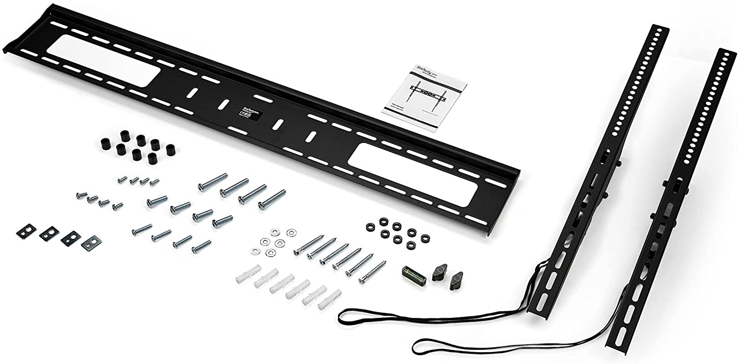 Save space and create an impressive display by wall-mounting a large TV in a boardroom or customer-facing area. This tilting flat-screen TV wall mount securely supports a TV up to 100" and features an attractive low-profile design. Create an Engaging Display for Digital Signage: Mount your large flat-screen TV in a location that's convenient for visitors, clients and employees. Create an engaging display to keep guests informed or entertained, ideal in lobbies, lecture halls, restaurants, health care centers and other meeting spaces. The television wall mount supports most 60" to 100" (812.8 to 1778 mm) LED or LCD flat panel TVs weighing up to 165 lb. (75 kg). It also supports curved TVs, with a compatible VESA mount up to 900x600. Tilting Design for Optimal Viewing: Find the ideal viewing angle. The tilting TV wall mount lets you tilt your display up (maximum 5 degrees) or down (maximum 10 degrees) with ease. Low-Profile Design: Save space with this slim TV wall mount. With its low-profile design, your TV sits just 3.3" (85 mm) from the wall. Robust Steel Construction and Easy Installation The heavy-duty TV mounting bracket securely supports your large flat-screen TV and is easy to install. The spring locks allow quick attachment and release. The open architecture provides ventilation and easy access to wires. FPWTLTB1 is backed by a StarTech 2-year warranty and free lifetime technical support. Heavy-duty TV wall mount fits most 60"- 100" TVs up to 165 lb. (75 kg). Smooth +5 /-10 tilt for the ideal viewing angle. Fits curved TVs, with compatible VESA mount. Space-saving low profile design sits just 3.3" (85 mm) from the wall. Spring locks for quick attachment and release.