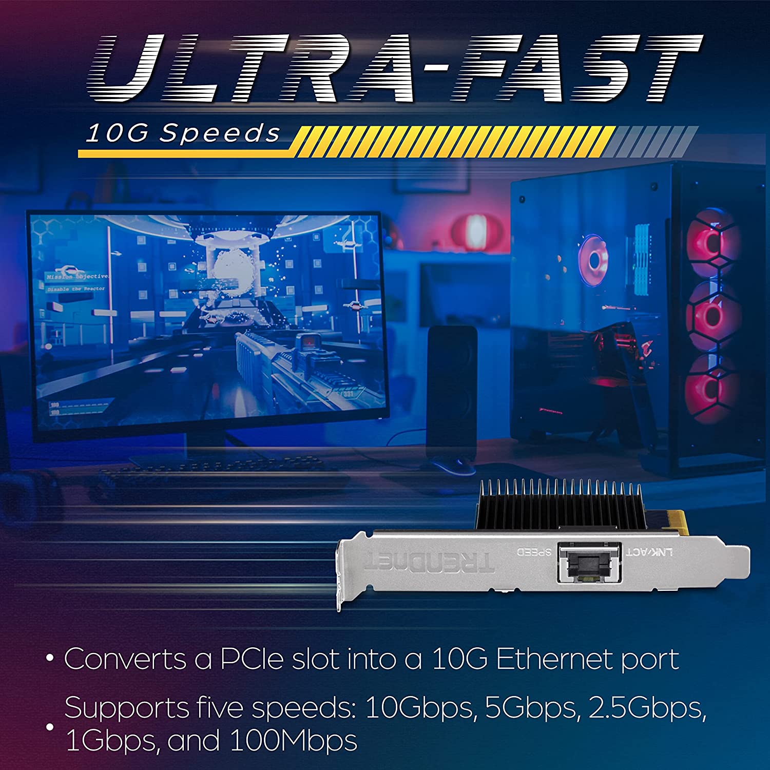 TRENDnet's 10 Gigabit PCIe Network Adapter, model TEG-10GECTX, converts a free PCI Express slot into a 10 Gigabit Ethernet port. The 10G PCIe card includes advanced features, such as jumbo frames and VLAN tagging support. The standard and low profile brackets included with the 10G PCIe card are compatible with Windows desktop computer designs.