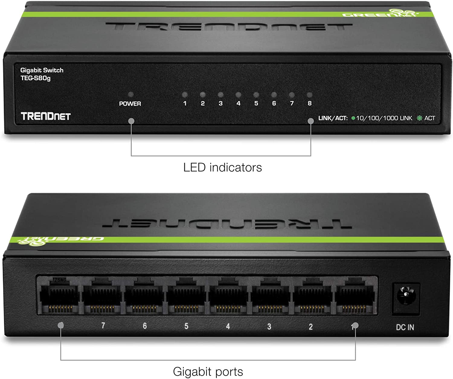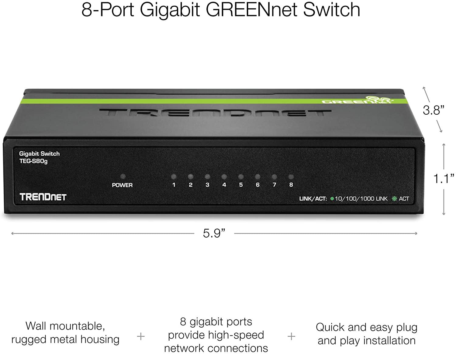 TRENDnet 8-Port Unmanaged Gigabit GREENnet Desktop Metal Switch, Ethernet Splitter, Fanless,16Gbps Switching Capacity, Plug & Play, Lifetime Protection, TEG-S80G,Black 8-Port Gigabit is backordered and will ship as soon as it is back in stock.