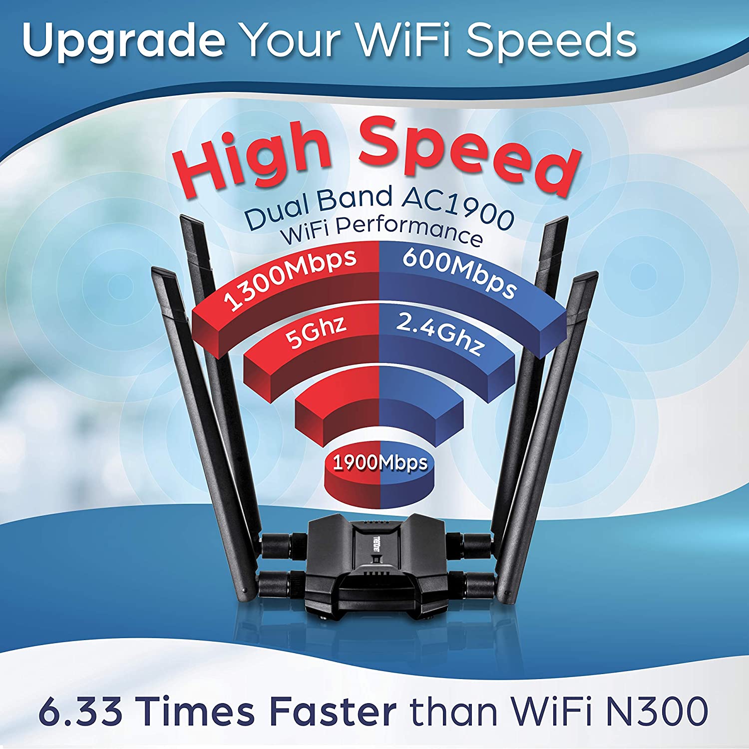 TRENDnet’s AC1900 High Power Dual Band Wireless USB Adapter, model TEW-809UB, upgrades a computer to Wireless AC1900. Quickly connect to a high performance Wireless AC network at 1300 Mbps or to a Wireless N network at 600 Mbps. A high power radio with detachable high gain antennas increase wireless coverage.