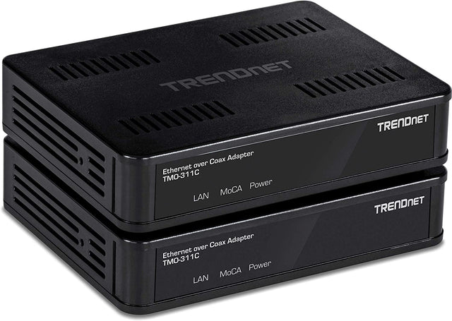 Trendnet's ethernet over coax adapters, model tmo-311c2k, uses your existing coaxial cables to extend a highspeedbuilding-wide triple play network throughout your home or office. These compact moca adapters are designed to supportmoca 2.0 deployment for digital tv, high speed-internet, and voip single-access subscription service offerings. Compliant withmultimedia over coax alliance (moca 2.0) standards with improved packet error rate technology that delivers consistent voice andvideo bandwidth with lowered latency.Moca 2.0supports multimedia over coaxial alliance 2.0with improved packet error rate technology that delivers consistent voice and video bandwidth with lowered latency.Compact designwith a compact and lightweight housingdesign, our moca adapters are well-suited fora variety of installations, such as your desktopor entertainment center.Easy installationno configuration needed, simply connect theadapters to the moca network to extend yournetwork over existing coaxial cabling.Package contents 2 x tmo-311c quick installation guide 2 x power adapter (12v, 1a)