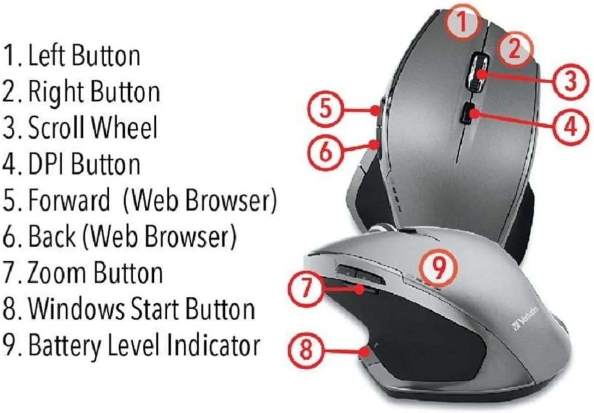 Wireless Desktop 8-Button Deluxe Mouse takes navigation and computing efficiency to a new level. Multi-button functionality lets you navigate within and between applications with ease. Use Blue LED technology to navigate on virtually any surface - from glass tabletop to granite countertop. The 2. 4GHz wireless performance provides lag-free cursor movement. The mouse connects to the computer via a nano receiver that is small enough to plug in and leave connected - great for computing on-the-go. When not in use, the receiver stores conveniently inside the battery compartment. You can click on the standard left/right button scroll wheel to scroll within web browser or documents without moving mouse. DPI Button controls mouse sensitivity (800, 1200, 1600). Back/forward buttons lets you easily navigate between pages in your browser. Button functionality on the contoured mouse also includes zoom for enlarging fine print and the Windows 8 Home button to launch applications quickly and easily.
